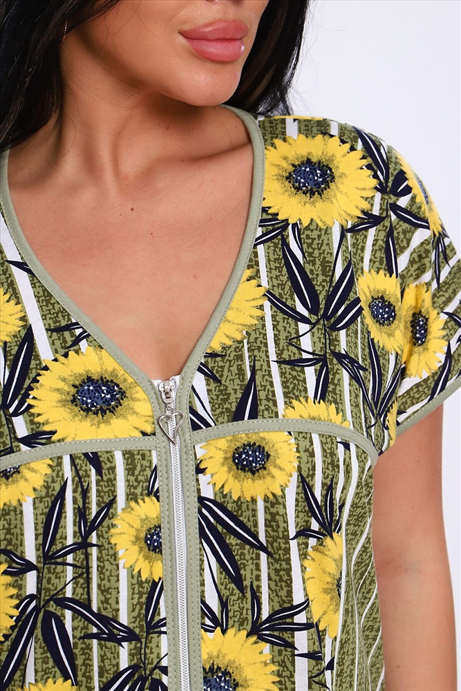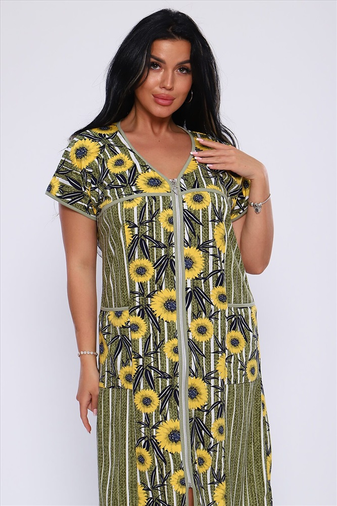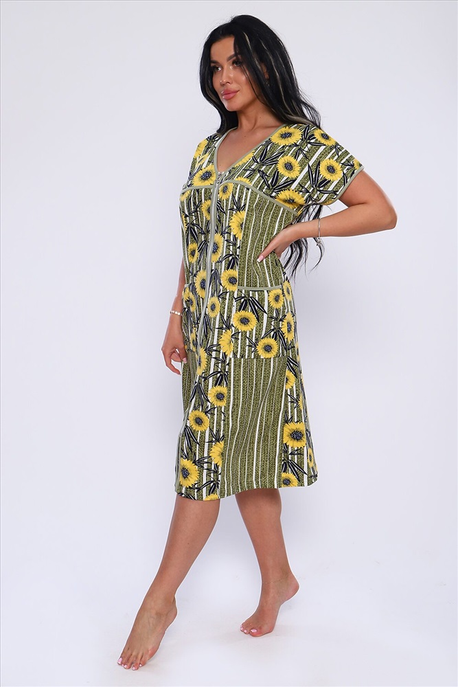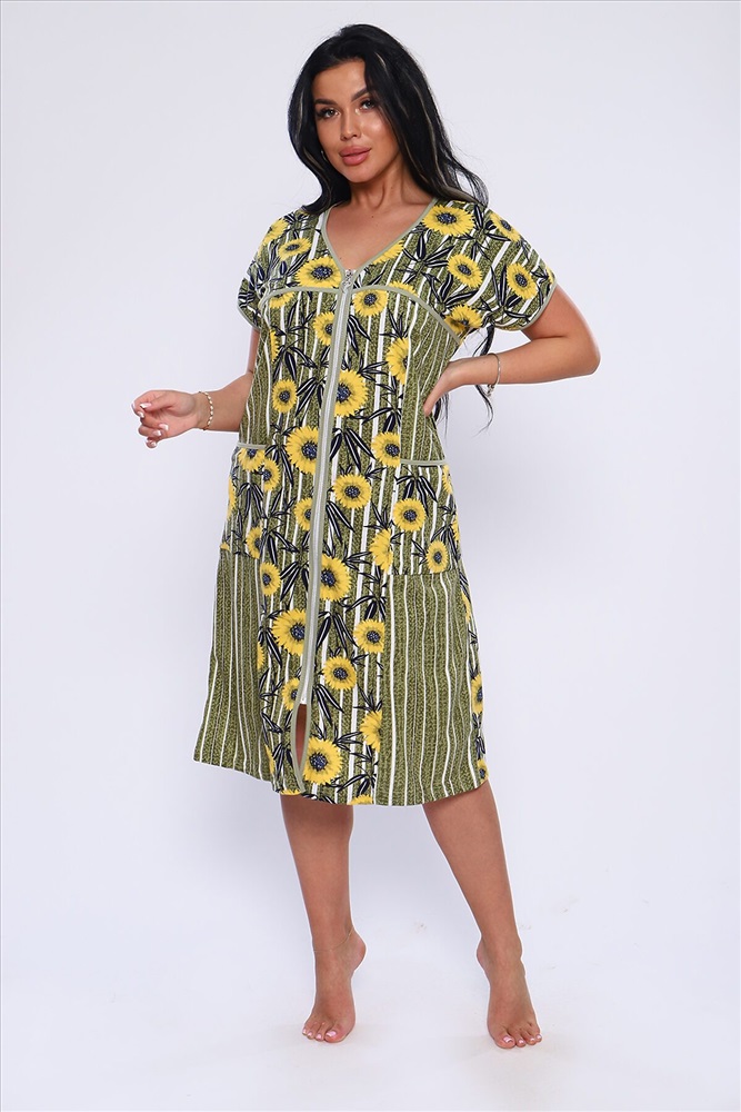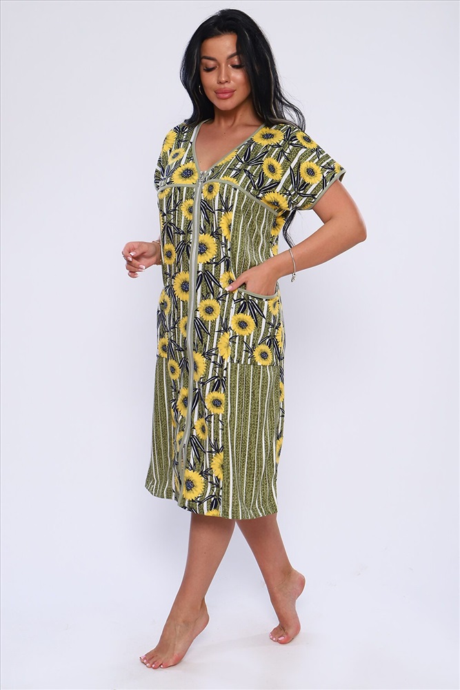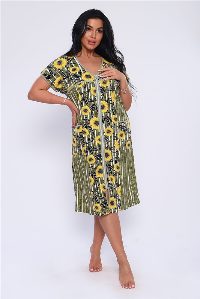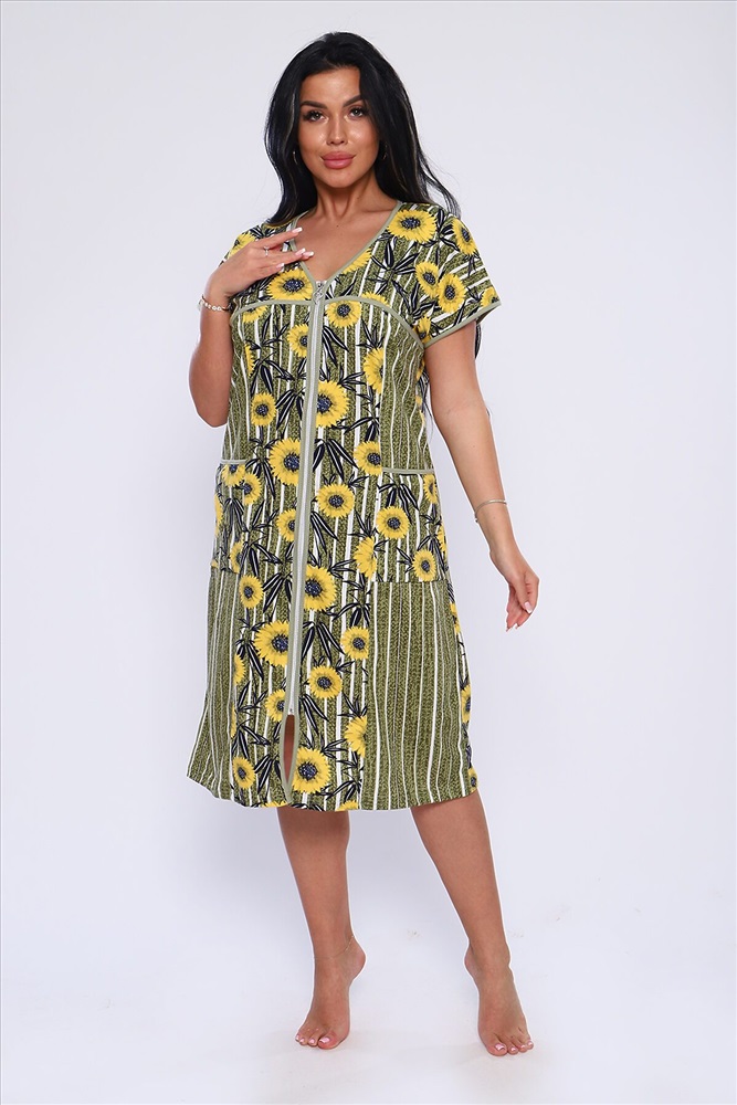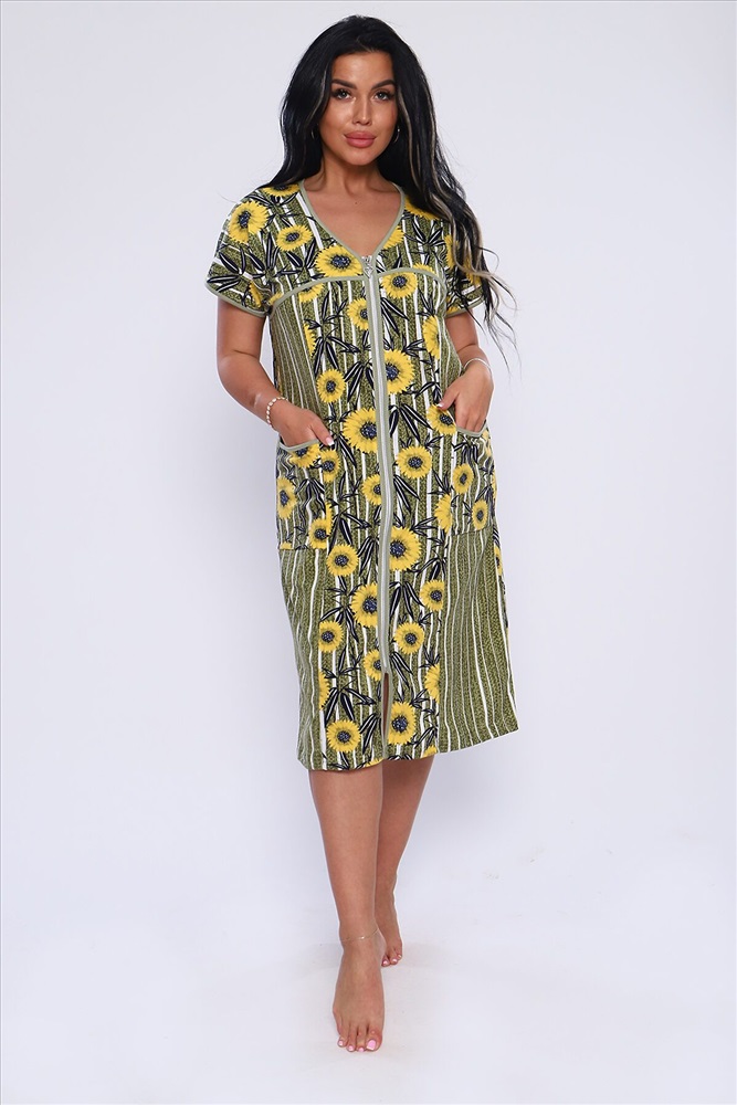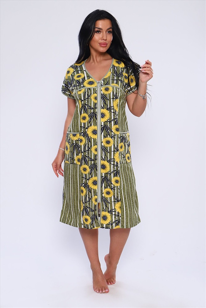 ID товара: 892674 Состав: 100% Хлопок Сезон: Демисезон Длина: Ниже колена Фасон: Полуприлегающий Рукав: короткие Вид застежки: Молния Декоративные элементы: Принт Основная ткань: Хлопок Вид ткани: Кулирка Страна бренда: Россия Страна производства: Россия Комбинированый халат полуприлегающего силуэта с двумя накладными карманами в рельефных швах Комментарии к товару