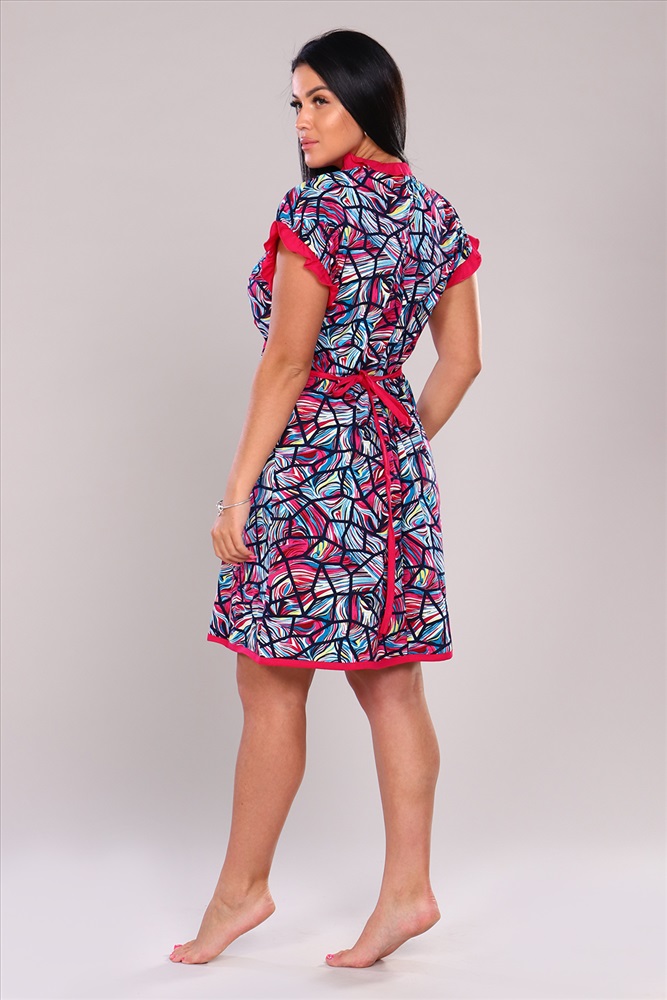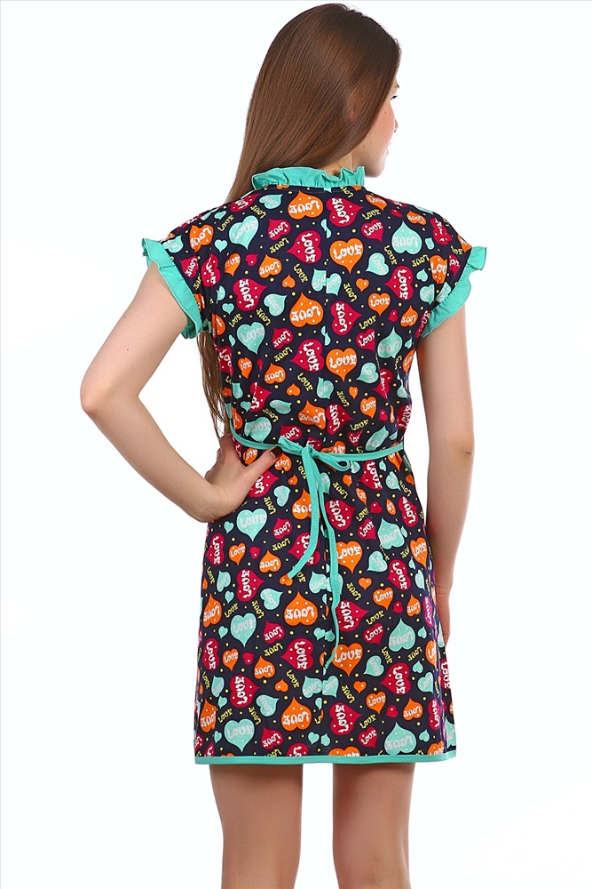 Застежка: на запах Женский запашной халат выполнен из 100% хлопчатобумажного полотна. Изделие полуприлегающего силуэта дополняют красивые оборки по горловине, рукавам и накладному карману. Данная модель прекрасно подойдёт для дома, дачи и отдыха неся в себе яркие нотки расцветки.