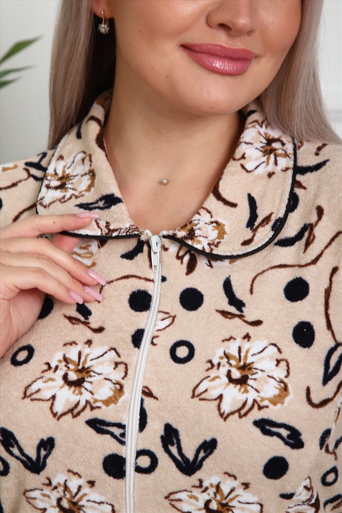 Застежка: молния Характеристика Ткань махра 95 % хлопок 5 % лайкра Размеры 50 - 60 на рост 164-175 Цвет бежевый с цветочками Предстваляем Вашему вниманию халат махровый на молнии с рукавом 3\4,с воротником, карманы обработаны декоративной контрастной окантовкой.