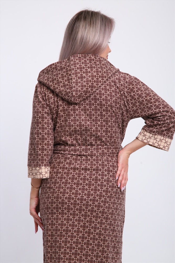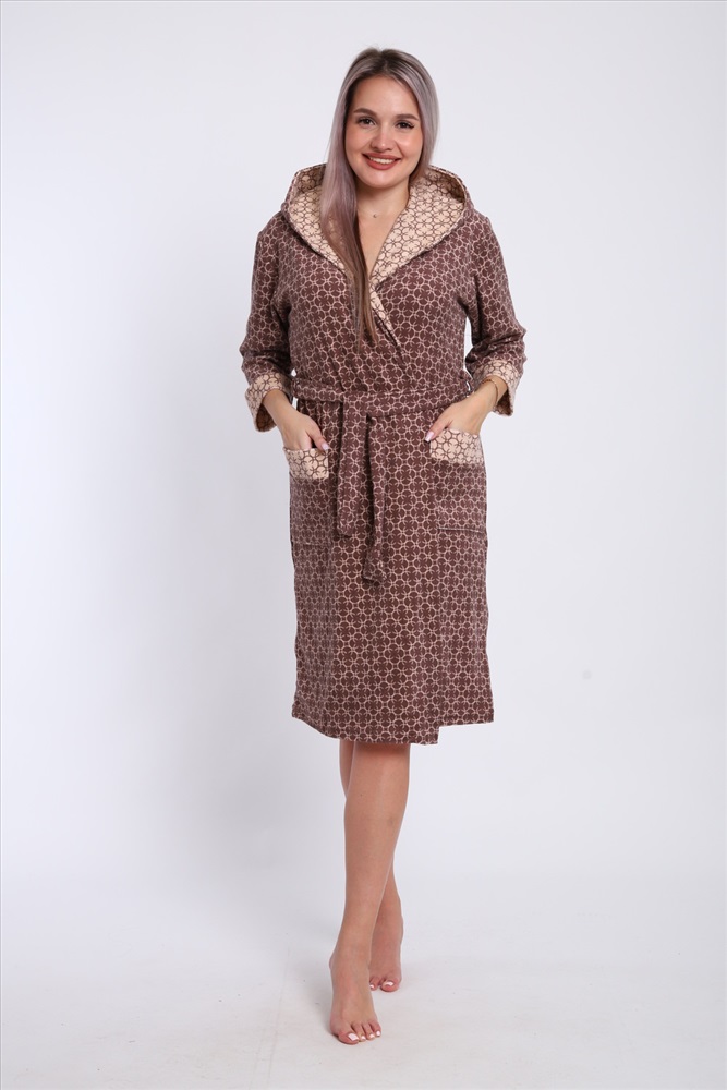 Застежка: на запах | пояс Халат женский из махры состав 80% хлопок 20% пэ. Халат с капюшоном и карманами. Халат на запах с поясом. Выполнен с тканью компаньон. Комфортный, средней длины.