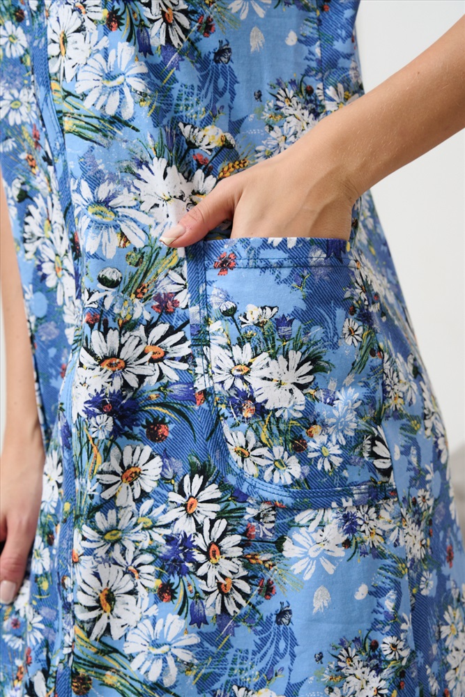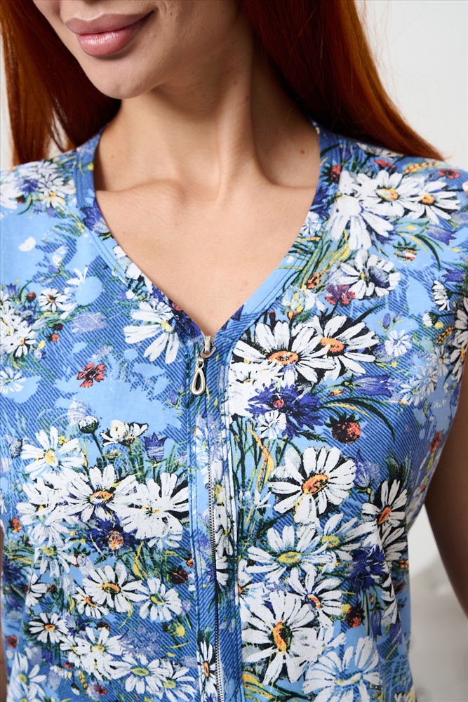 Застежка: молния Халат-сарафан на молнии для дома и дачи. Простой, удобный, ничего лишнего. Нежные ромашки для хорошего настроения. Накладные карманы очень пригодятся для разных мелочей. Удобная длина, молния спрятана под бейку. Носите с удовольствием !