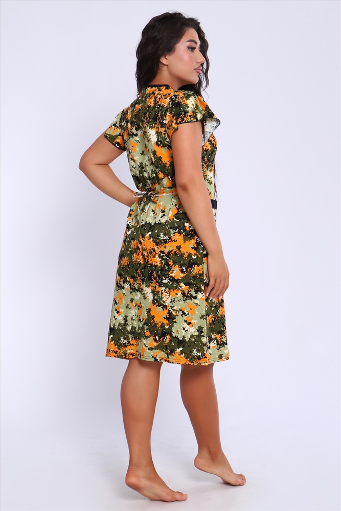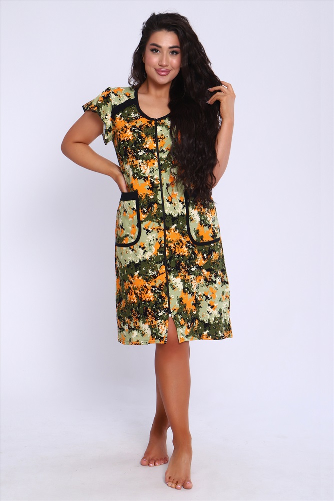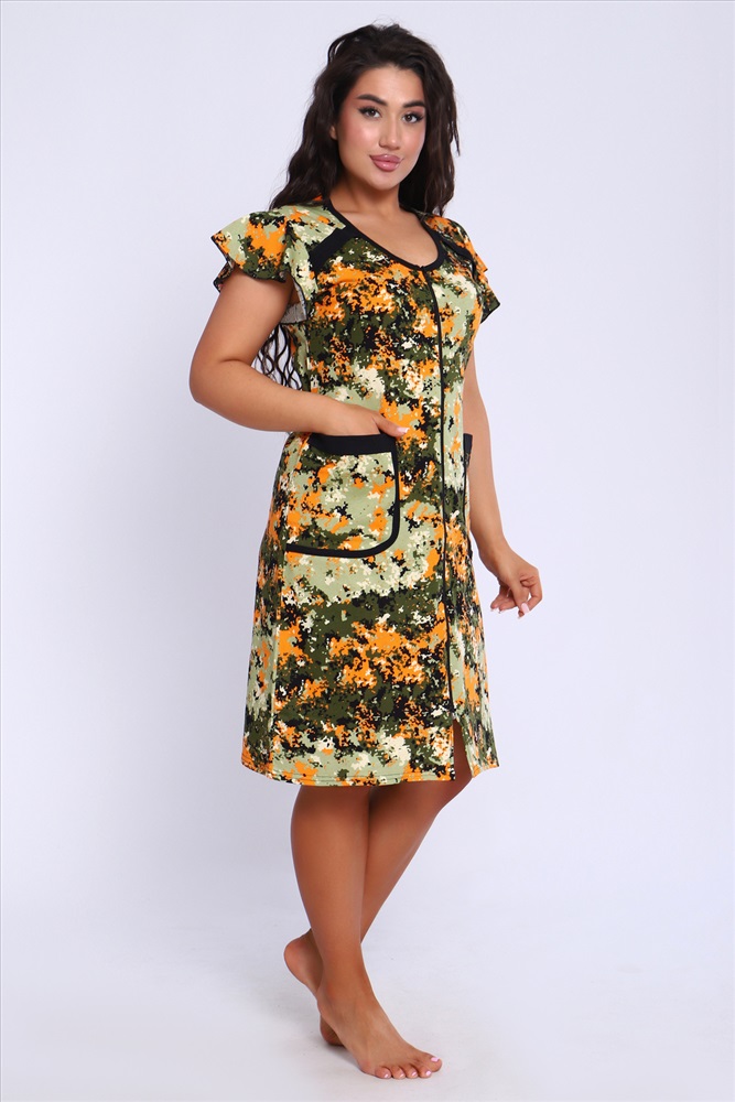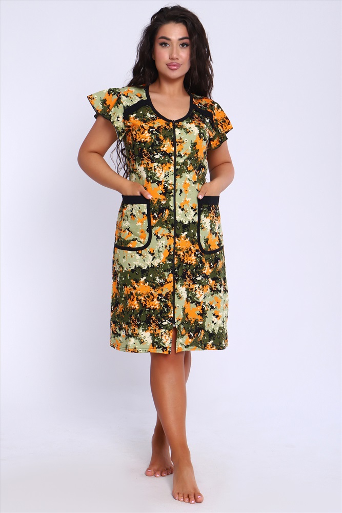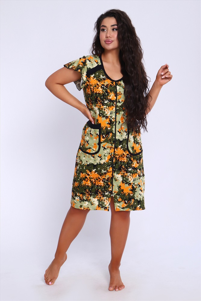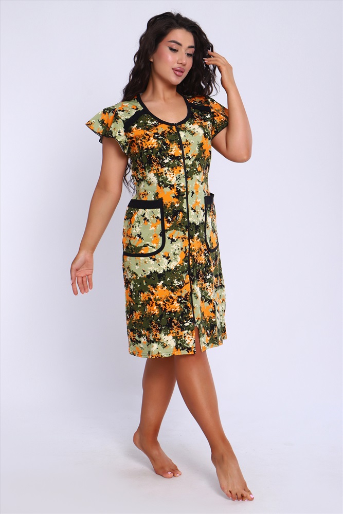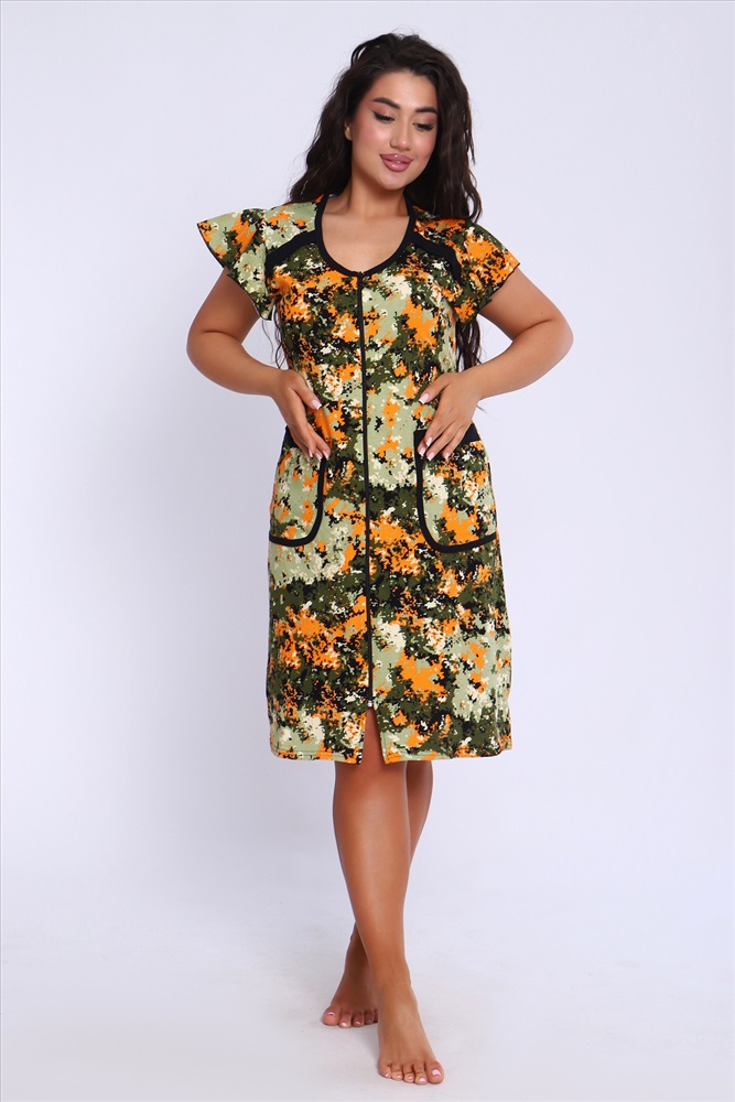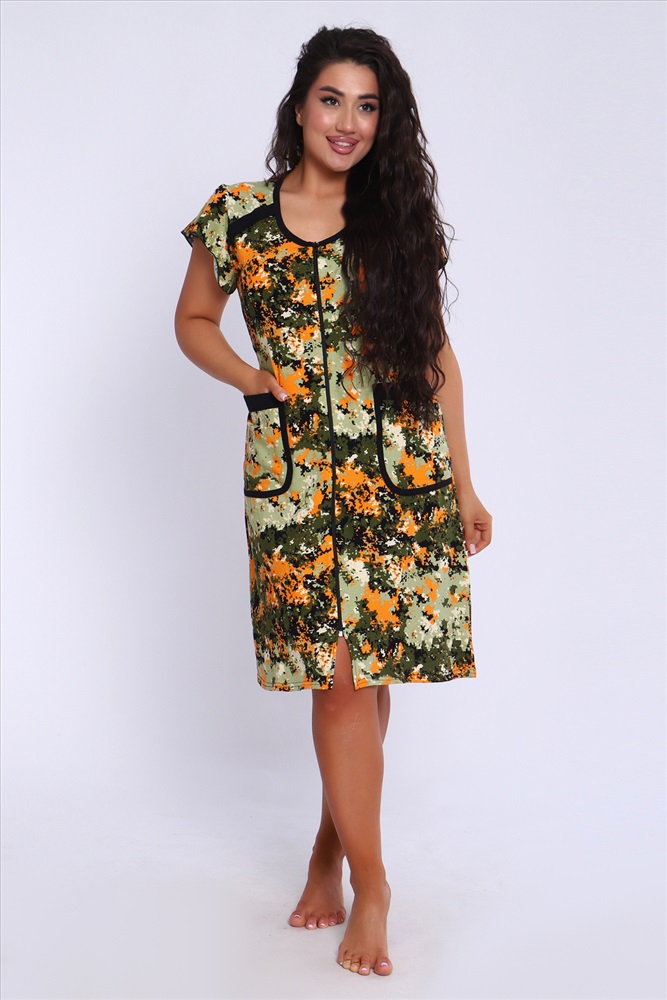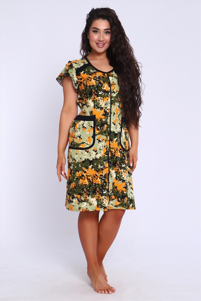 Застежка: молния Халат женский из кулирки на молнии с поясом, с короткими рукавами, с накладными карманами. Застежка-молния, длина ниже колена, очень приятный к телу.