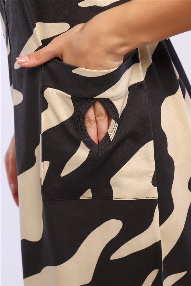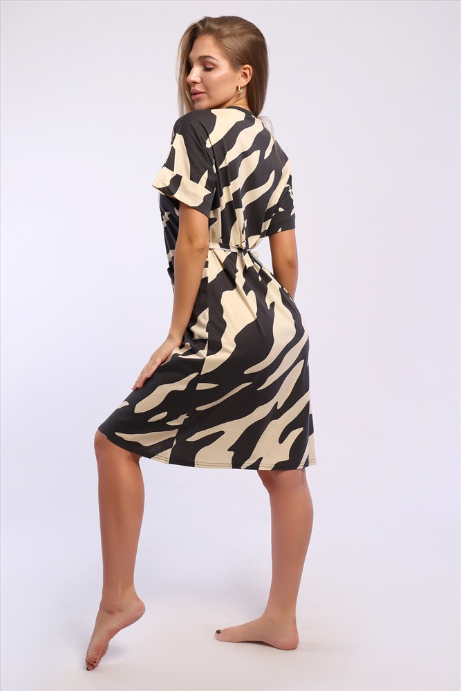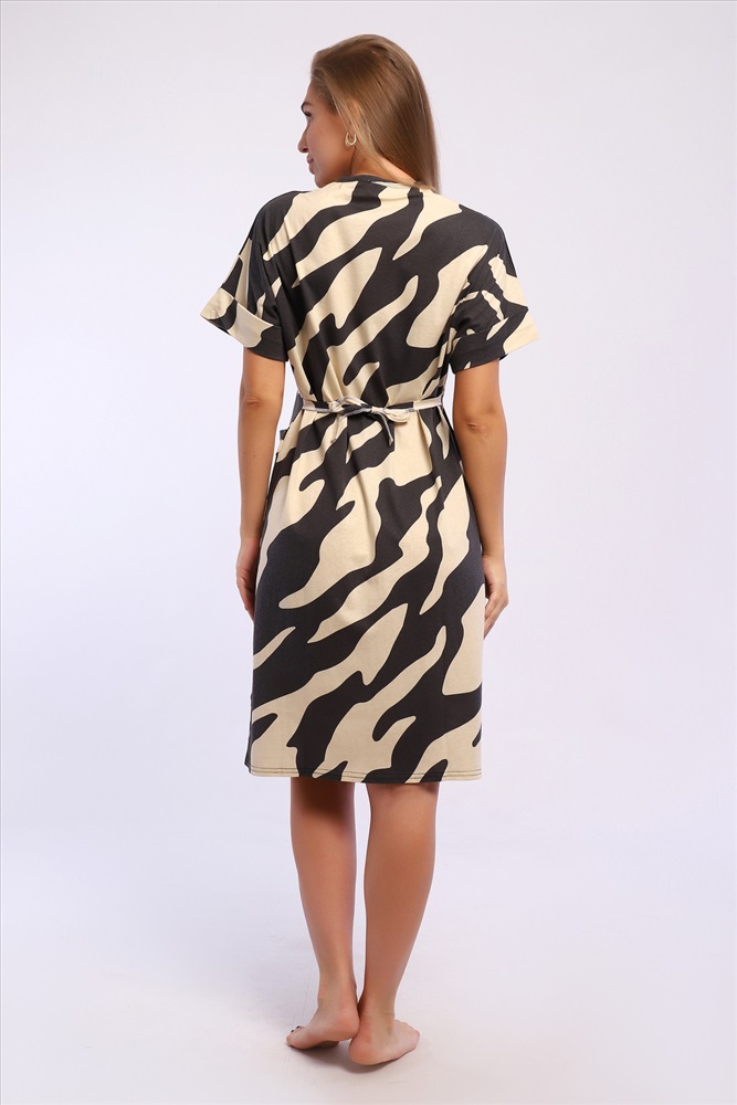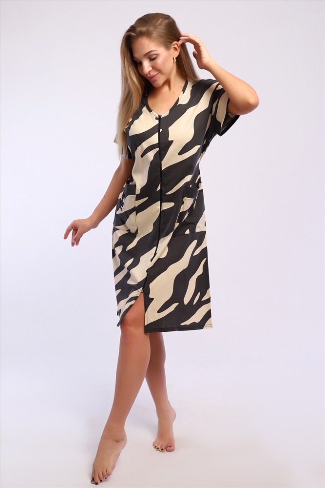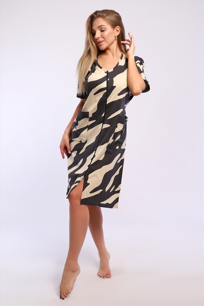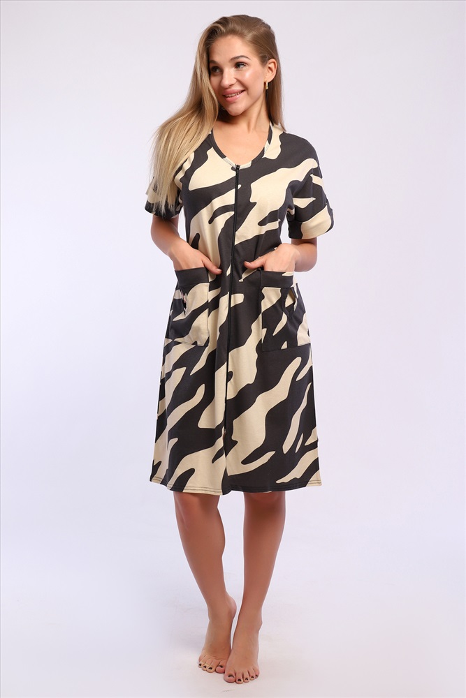 Застежка: молния Этот халат выполнен в современном камуфляжном стиле с преобладанием черных и бежевых цветов. Он имеет короткие рукава и длину до колена, что делает его удобным и практичным для повседневного ношения. Спереди халат застегивается на молнию, что обеспечивает легкость надевания и снятия. На боковых сторонах имеются два глубоких кармана с оригинальными овальными прорезями, которые добавляют модели функциональности и стильности. Халат также дополнен поясом, который подчеркивает талию и позволяет регулировать посадку по фигуре. Материал, из которого изготовлен халат, мягкий и приятный к телу, что обеспечивает комфорт при носке.
