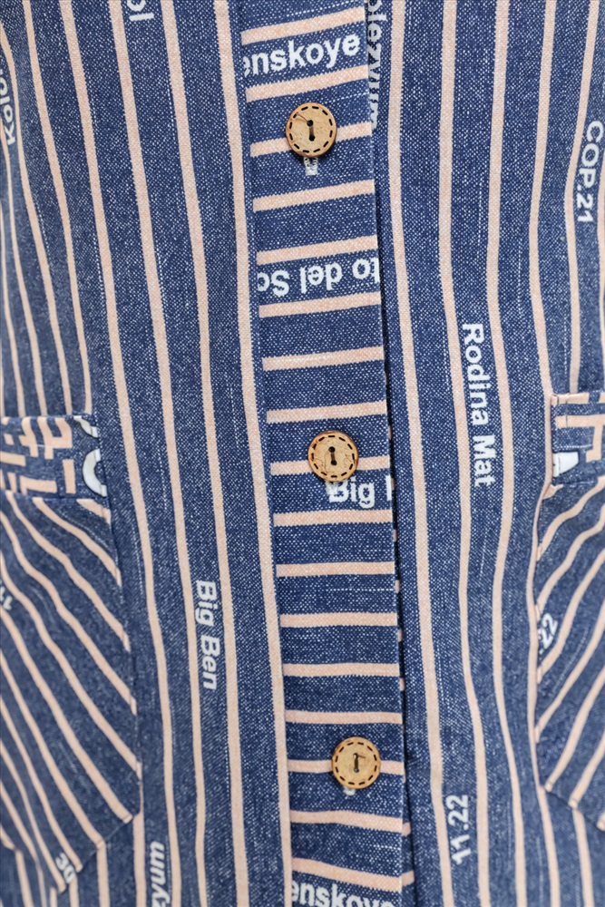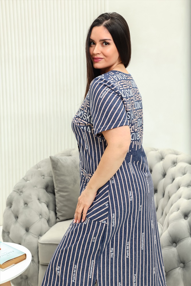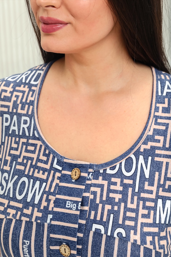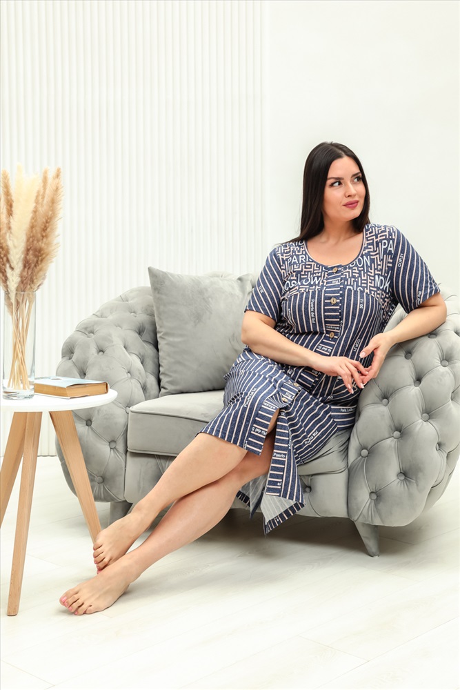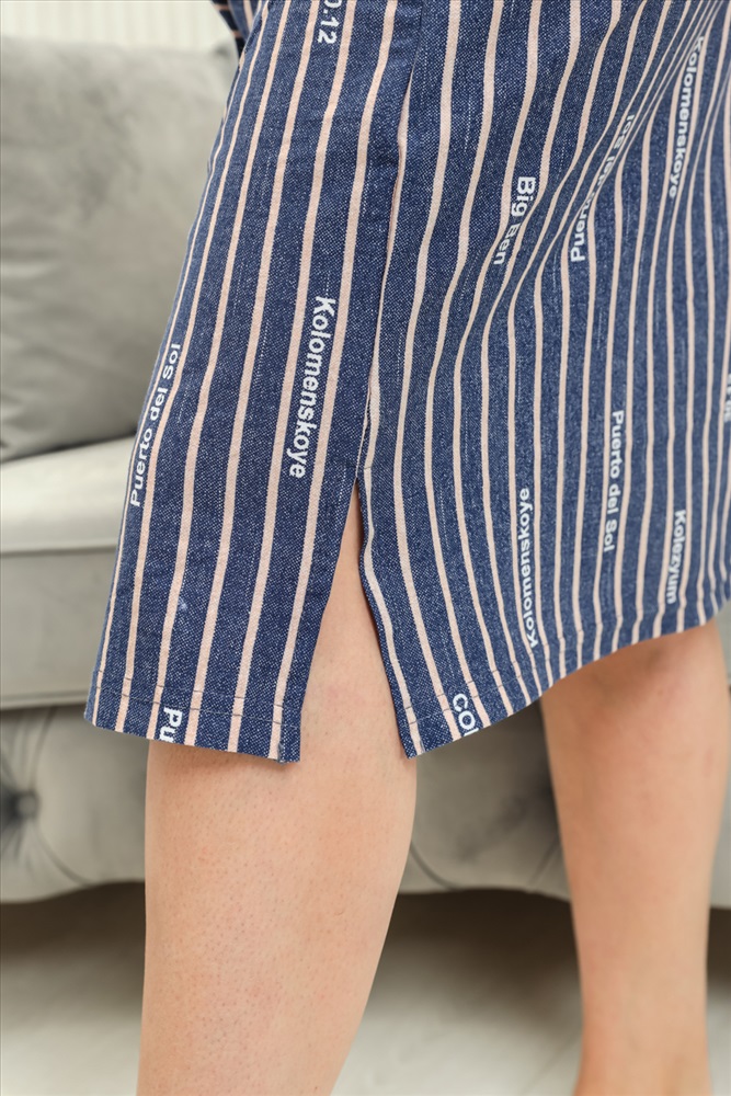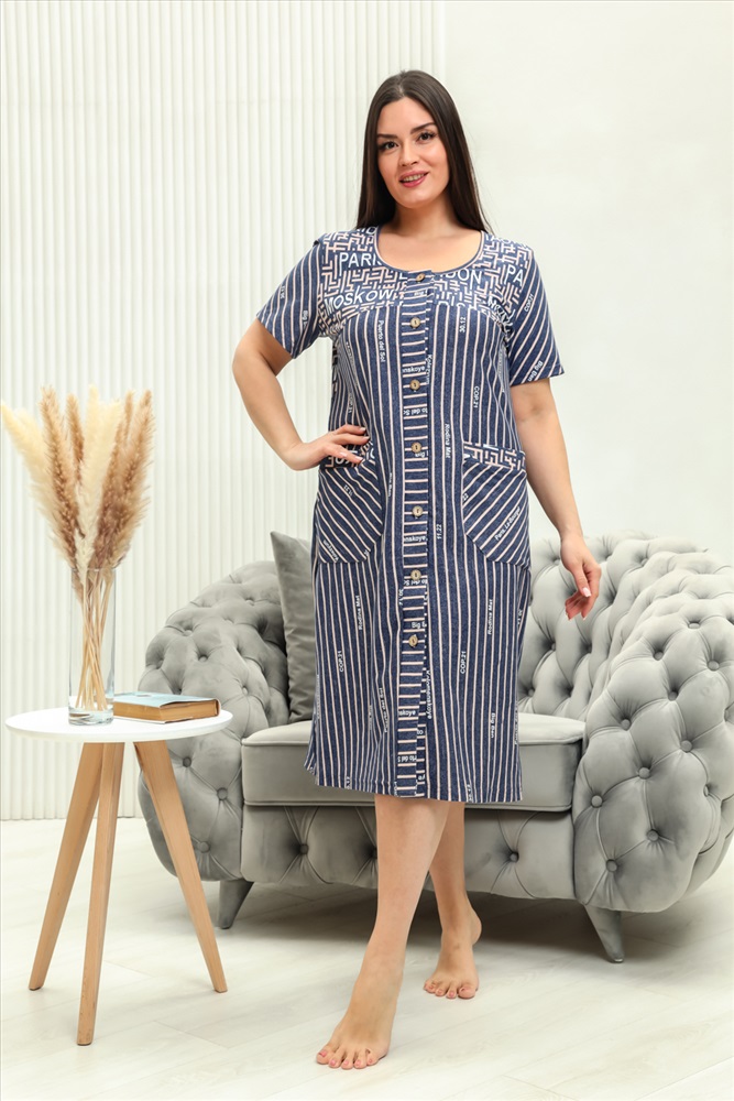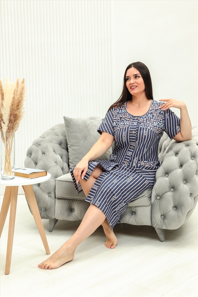 Застежка: пуговицы Халат с застежкой на петли и пуговицы, полуприлегающего силуэта, длиной ниже колена, с округлой горловиной, с фигурными накладными карманами. Рукав втачной, короткий. В верхней части полочки расположены кокетки. С разрезами в нижней части боковых швов. Горловина обработана бейкой из основного полотна.