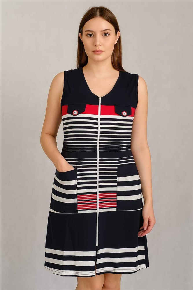 Застежка: молния Халат женский без рукавов на молнии. Два накладных кармана по бокам, свободный крой без пояса. Декоративные пуговицы спереди. Модель выполнена из 100% хлопка.