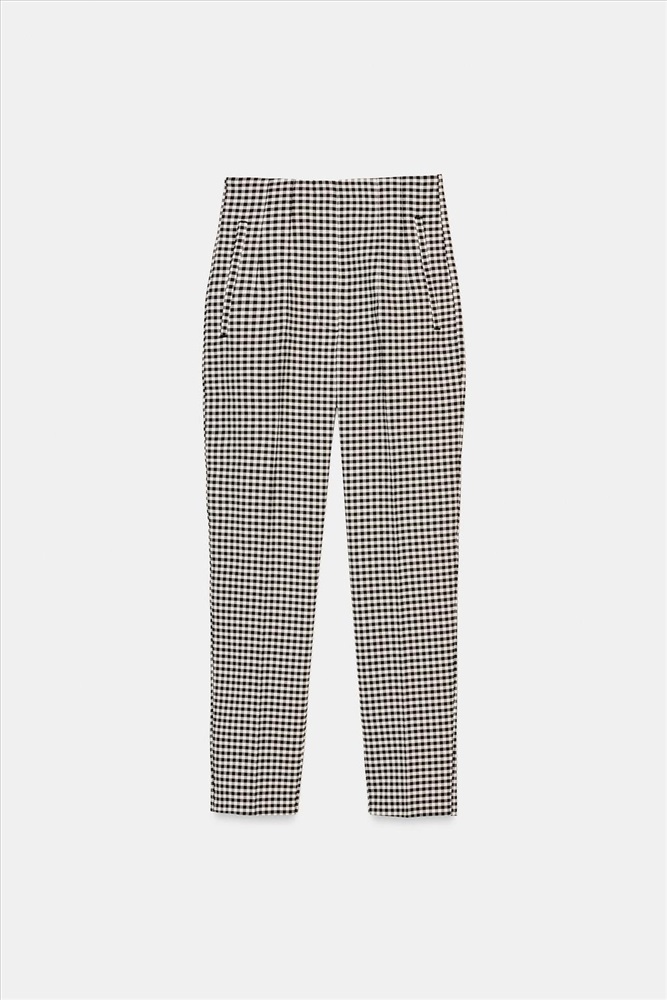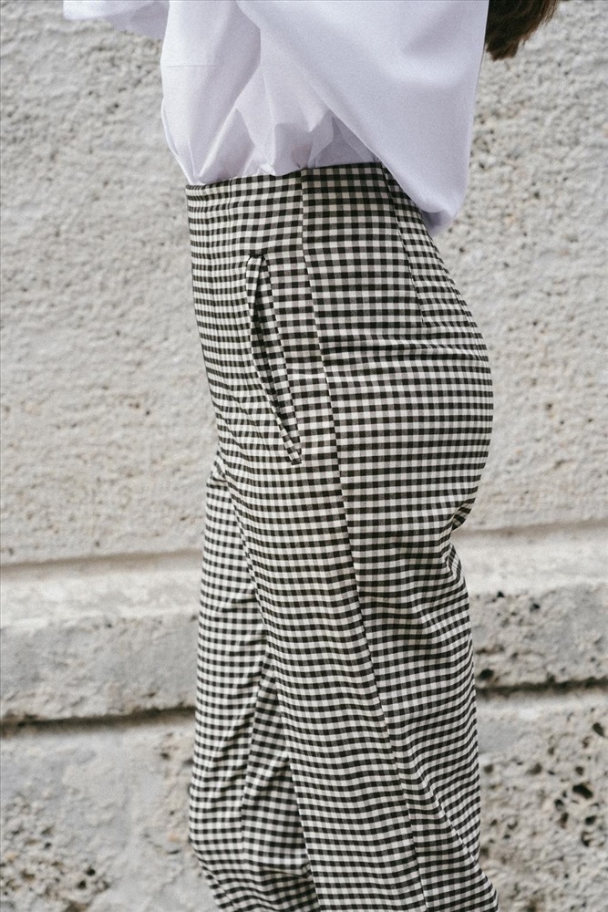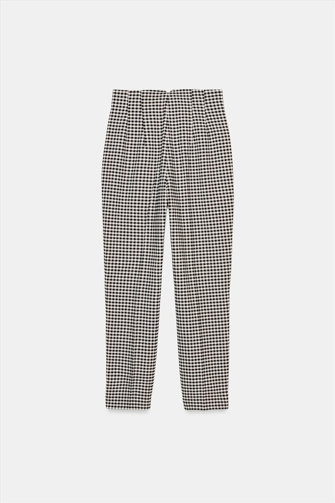 High-waist cropped trousers with pronounced seams on the front and back. Featuring front welt pockets. Gingham print. Front fastening with zip, inside button and metal hook.