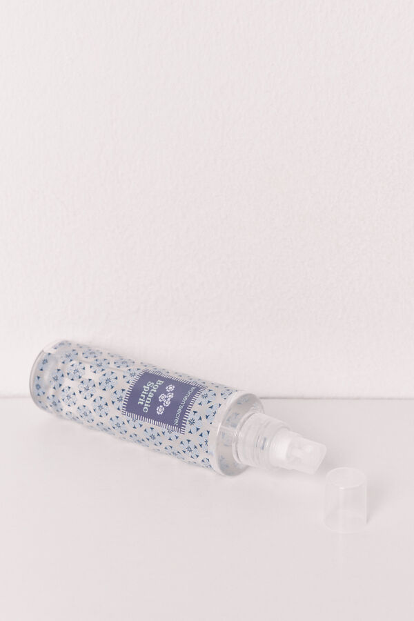 La fórmula fragance mist permite aplicarse sobre el cuerpo, la ropa o la cama, ofreciendo una sensación de frescura y calma que transforma el ambiente y eleva tu rutina diaria. Combina aromas frutales y florales que envuelven tus espacios en serenidad y bienestar. Su packaging, con estampado tipo sello y tonos azules, refleja una estética con cierto toque botánico.