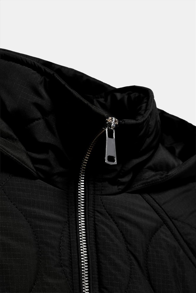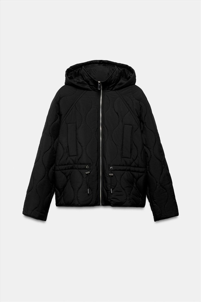 Puffer jacket with a high neck, hoodie and long sleeves. Adjustable drawstring waist. Front welt pockets with a hidden snap-button fastening. Zip-up front.