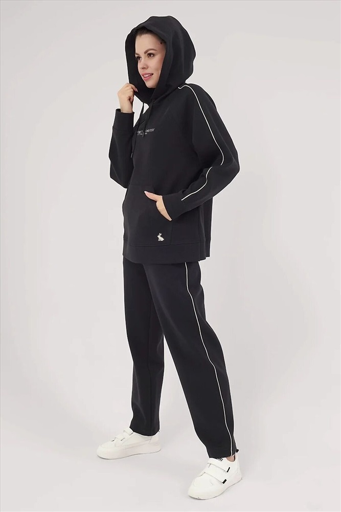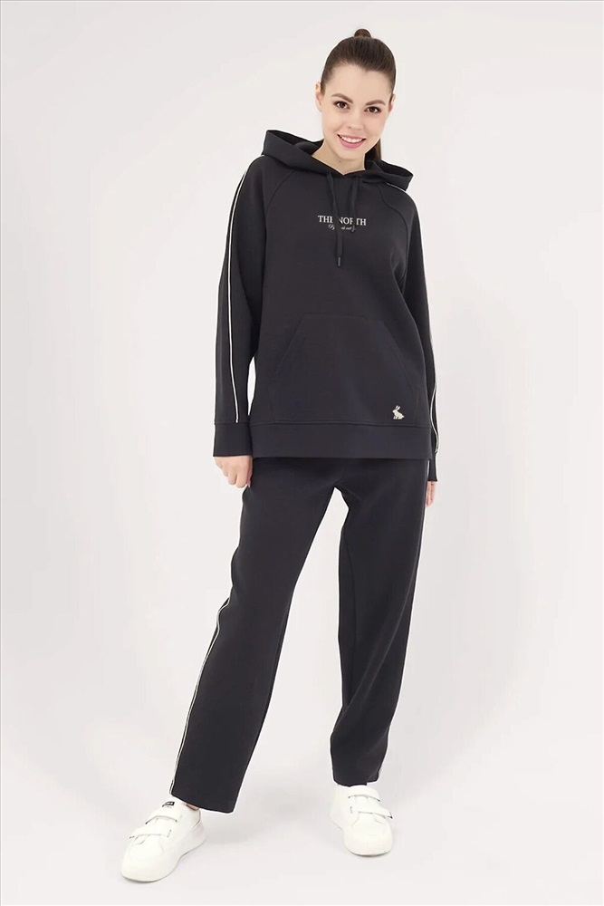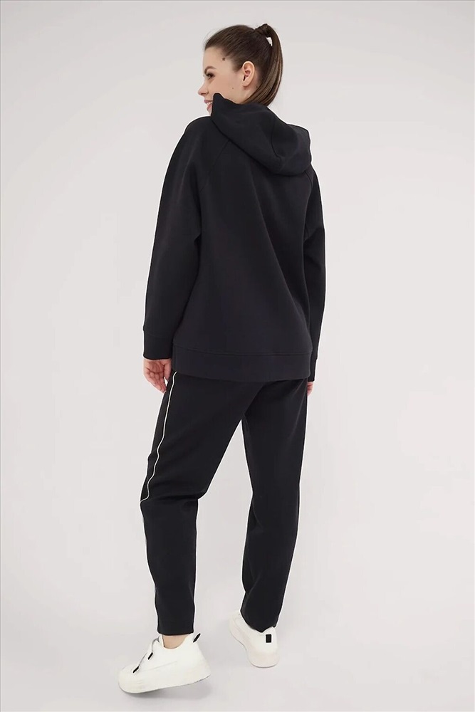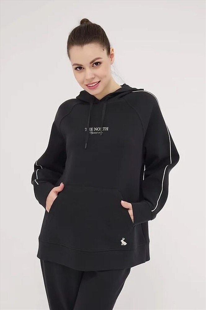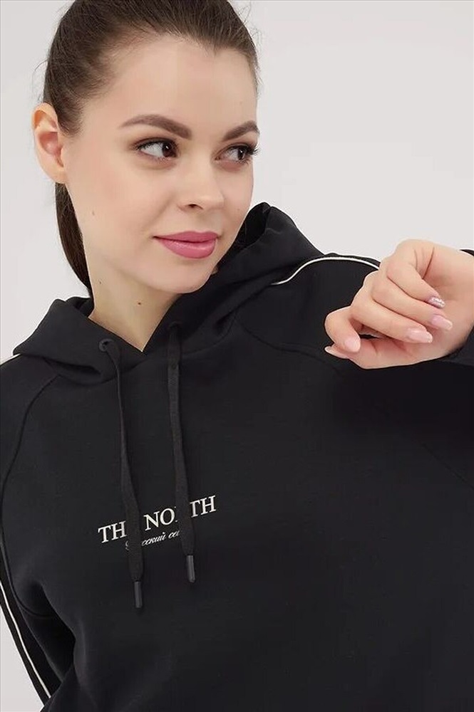 Джемпер спортивный из трикотажного полотна, свободного кроя. По горловине капюшон со шнуром. Длинный рукав реглан. По низу рукава и изделия манжет. Спереди карман кенгуру, принт вспенка. По линии плеча и рукаву контрастный кант. На полочке принт.