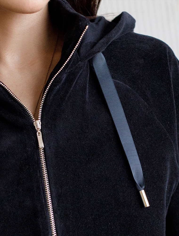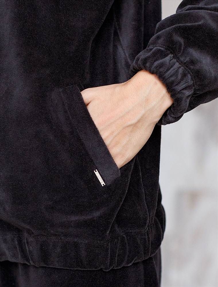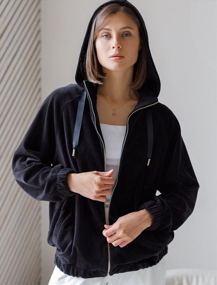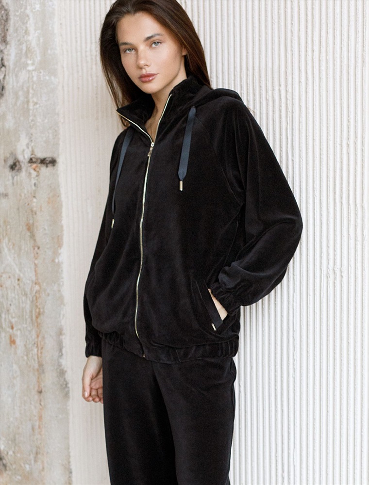 Худи на двухсторонней молнии выполнено из бархатистого велюра. Модель дополнена резинкой по низу и боковыми карманами. Легкий и мягкий материал с матовой фактурой придает изделию нежность и комфорт. Хорошо держит тепло и форму – идеальное решение для домашнего отдыха. Сочетается в костюме с брюками D44.117