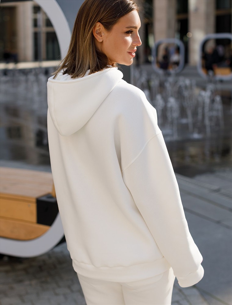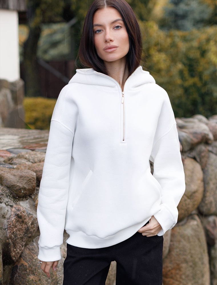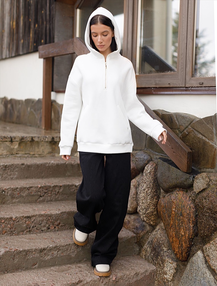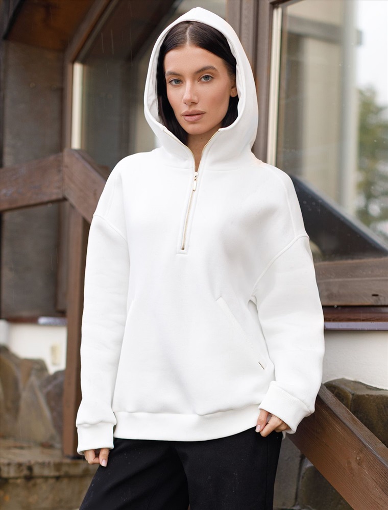 Параметры модели на первом фото: Рост 170, бюст 89, талия 63, бедра 92 Худи с воротом на молнии выполнено из премиального футера трехнитки с теплым начесом. Модель дополнена боковыми карманами и золотистой фурнитурой, что поддерживает актуальный стиль спорт-шик. Свободный крой подходит для любой фигуры. Ранней осенью или поздней весной можно носить в качестве верхней одежды. Сочетается в костюме с брюками D44.133.