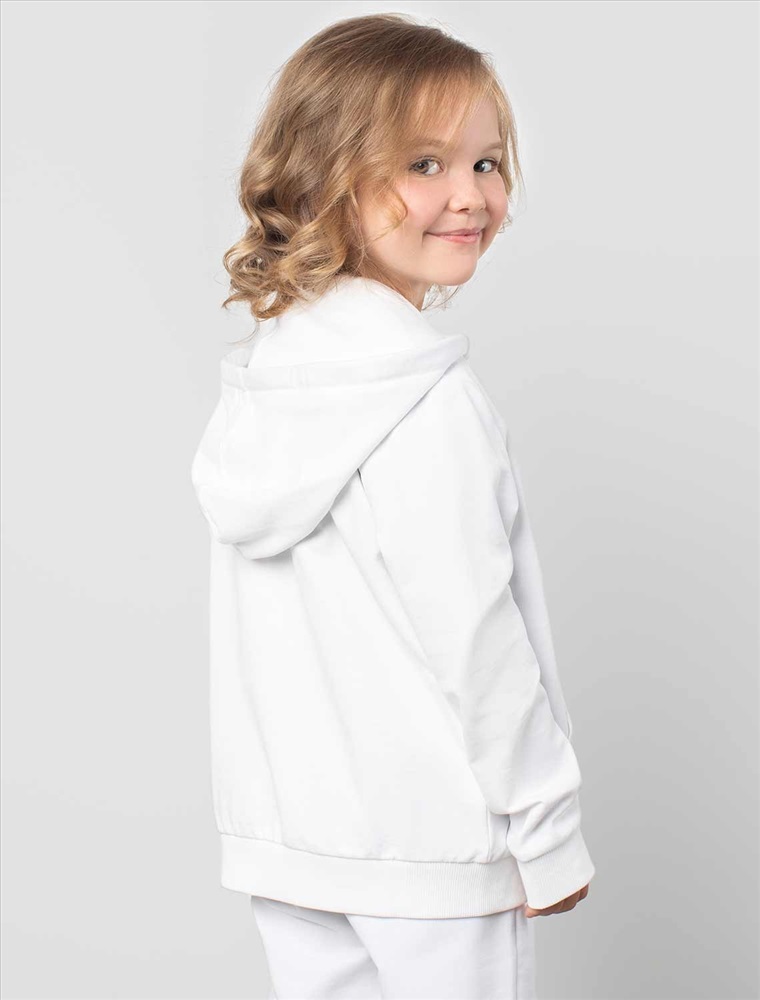 Белое худи на молнии с длинными рукавами и спущенной линией плеч сшито из премиального хлопкового футера. Материал отлично поддерживает циркуляцию воздуха, а крой не ограничивает движения. Модель с высококачественной золотистой фурнитурой украшена устойчивым принтом. Идеально в костюме с брюками F44.060