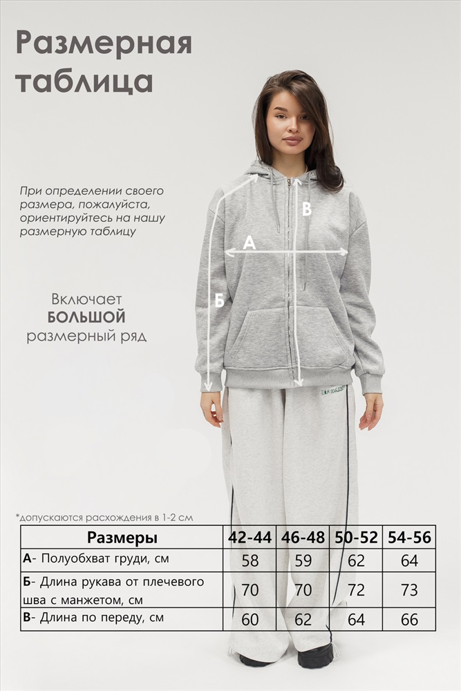 Модель универсальна и подойдёт для прогулок, активного отдыха и домашнего уюта, доступна в размерах 4256 при желании менее выраженного оверсайза рекомендуем выбрать размер на единицу меньше. Уход прост: стирка при 30C в деликатном режиме, вывернуть наизнанку и застегнуть молнию, не отбеливать, сушить в расправленном виде и при необходимости гладить через ткань при низкой температуре.