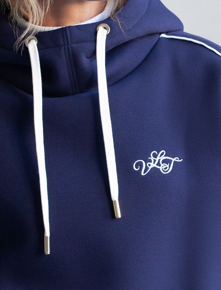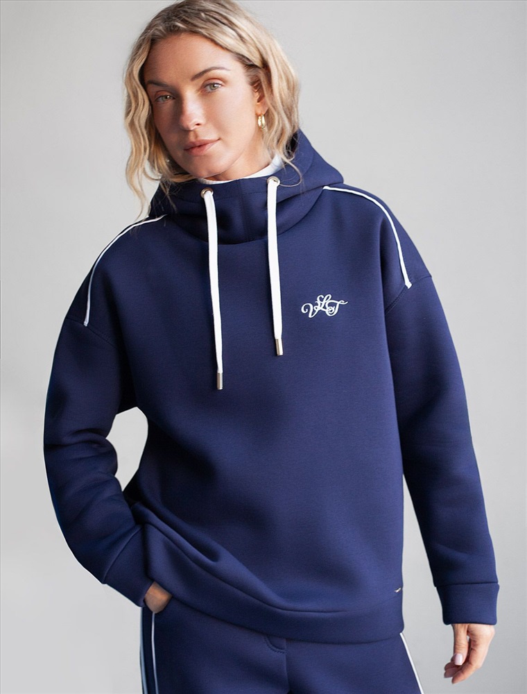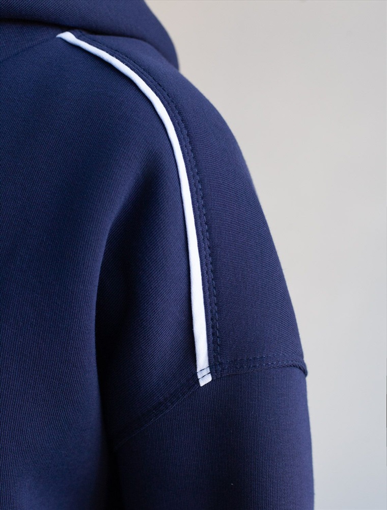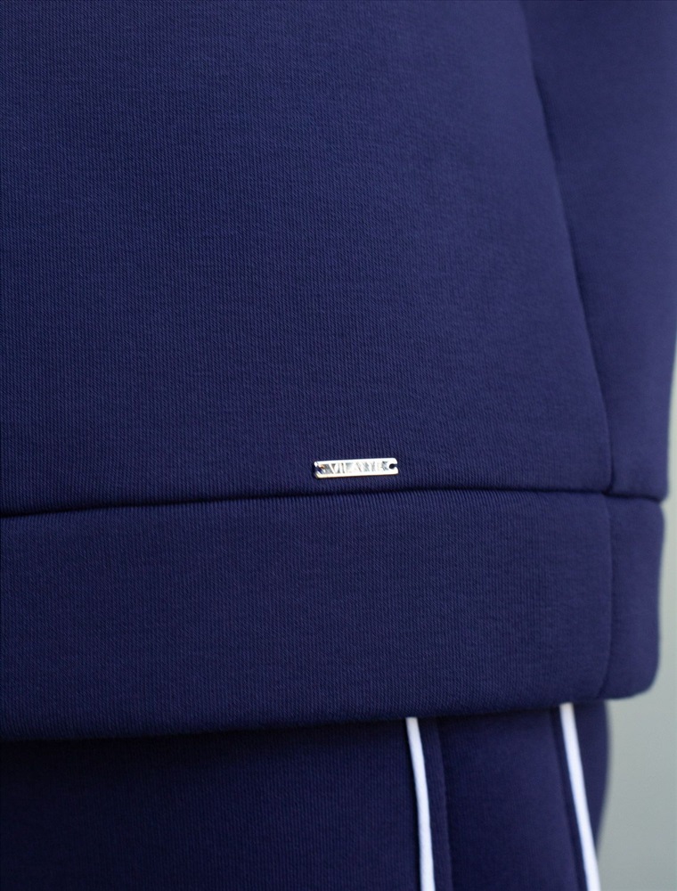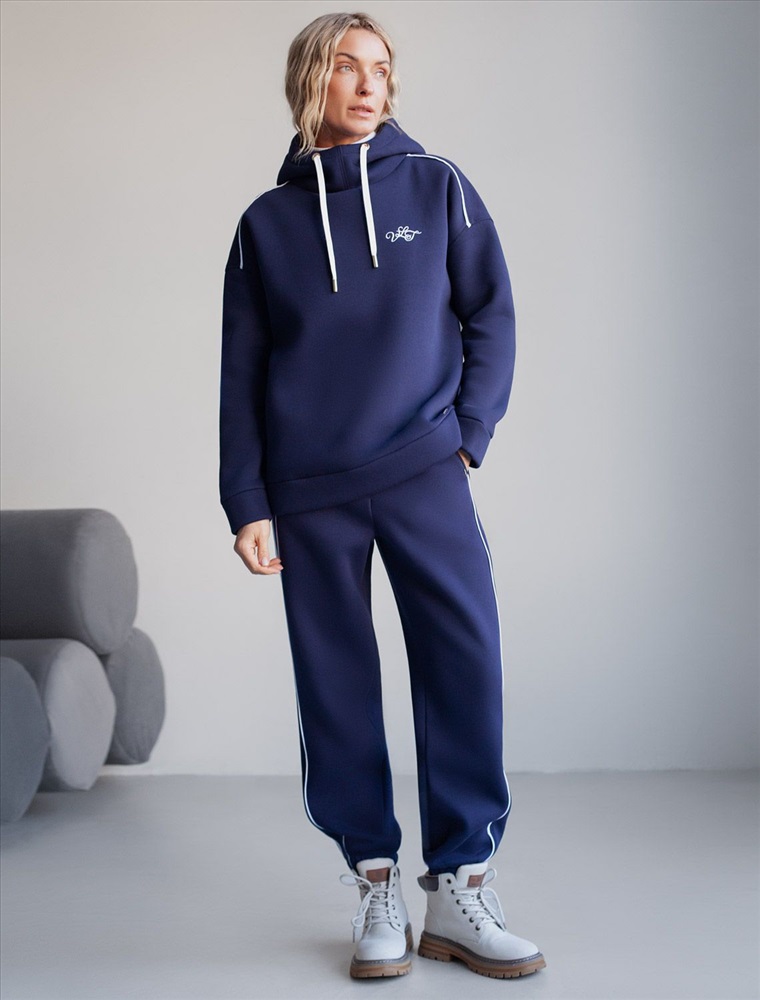 Уютное худи темно-синего цвета с цельнокроенным капюшоном и спущенной линией плеча создано для комфорта в холодную погоду. Модель выполнена из премиального футера трехнитки с мягким начесом, что обеспечивает дополнительное тепло и приятные ощущения при носке. Глубокий капюшон дополнен шнуром для регулировки объема, что обеспечивает отличную защиту от ветра и холода, а серебристая фурнитура добавляет стильный акцент к современному худи. Элементы дизайна — минималистичная вышивка с логотипом бренда и тонкие онтрастные лампасы — делают худи более выразительным без перегруженности деталями, сохраняя эстетичность и современный вид. Эластичные манжеты на рукавах обеспечивают дополнительную защиту от продувания, способствуя сохранению тепла внутри. Натуральный хлопок гарантирует дышащий эффект, позволяя сохранять оптимальный микроклимат тела даже при длительном ношении. Благодаря эластану в составе повседневное худи подходит для активного отдыха, вы будете чувствовать себя свободно в любой ситуации. Представлены большие размеры, что позволяет выбрать подходящий вариант для разных типов фигуры, обеспечивая комфортную посадку. Подойдет девушкам плюс сайз, в этом теплом джемпере вы будете чувствовать себя уверенно. Универсальный дизайн гармонично сочетается с повседневной одеждой — джинсами или спортивными штанами, вы можете составить комплект с брюками D44.158 и D44.159. Создайте расслабленный образ без лишних усилий с помощью этого стильного худи! Сочетается в костюме с брюками D44.159