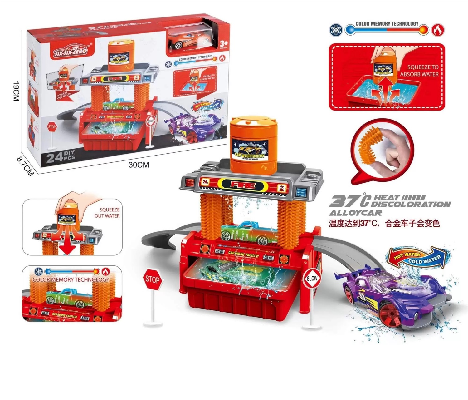 Парковка автомойка Пожарная станция, в комплекте 1 машинка и 8 дорожных знаков. Машинка меняет цвет от температуры воды