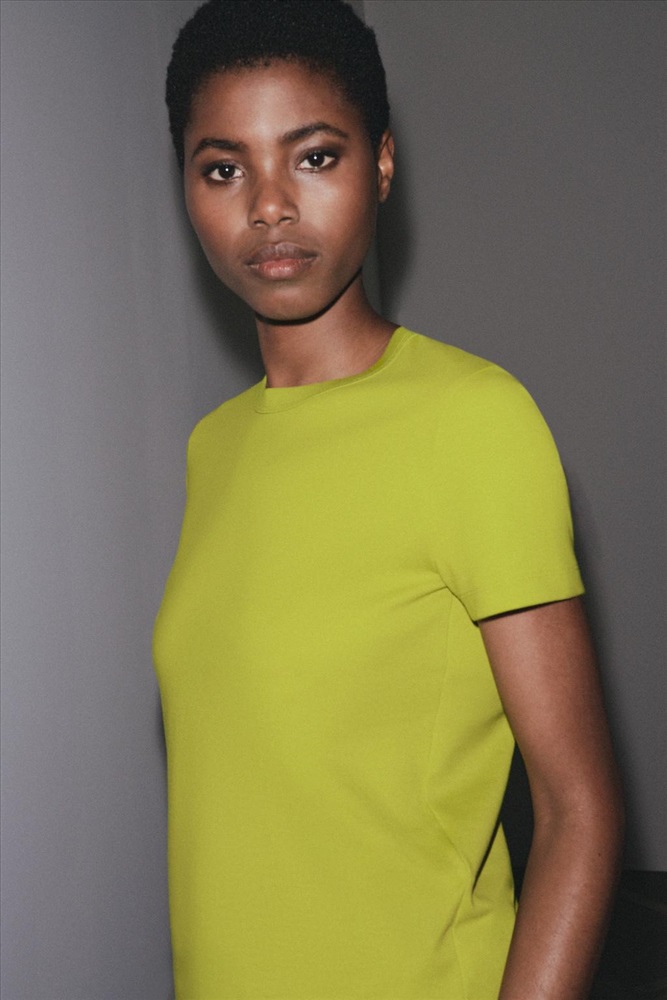T-shirt made from elastic and flexible knit fabric with a compact, soft, and opaque weave. Round neck and short sleeves.