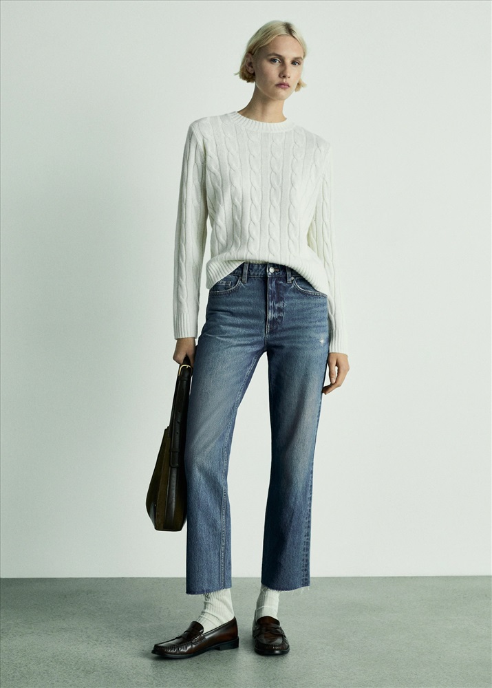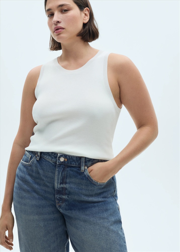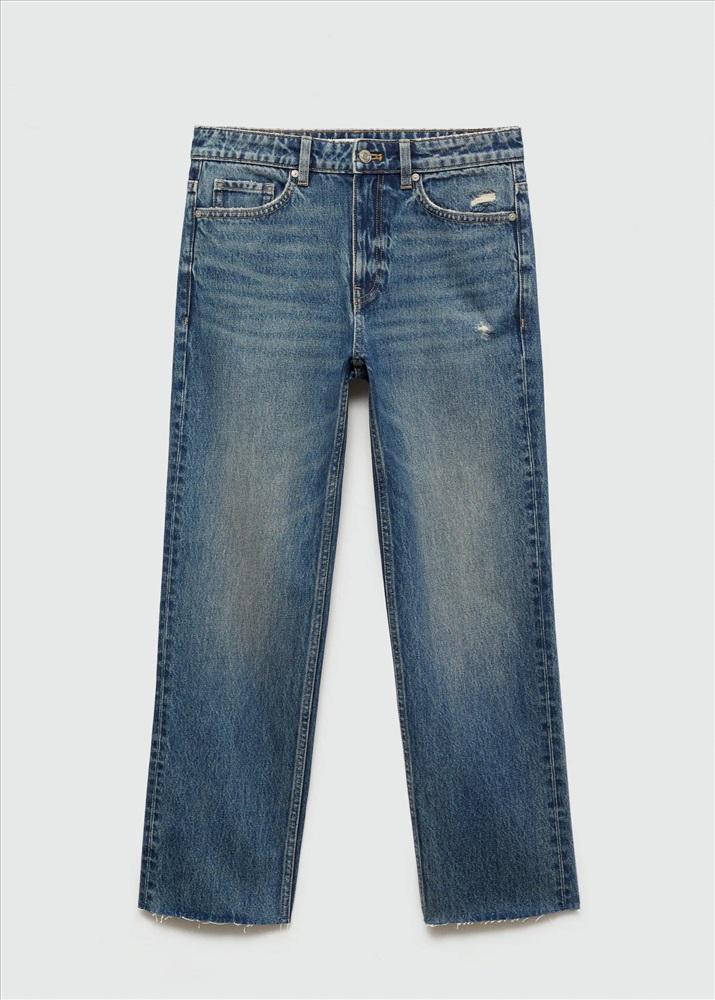 Tejido de algodón estilo tejano vaquero. Diseño recto. Diseño crop. Tiro medio. Trabillas. Cinco bolsillos. Cierre de cremallera y botón. Bajo deshilachado. Largo interior 68 cm. Disponible Plus.