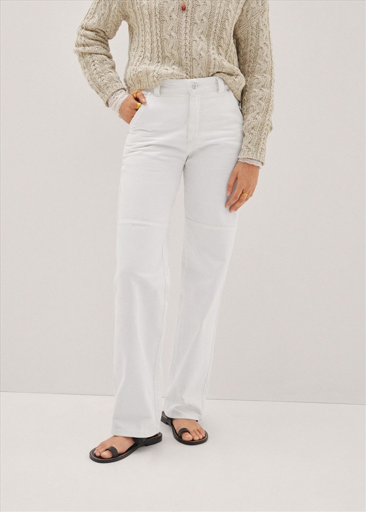Tejido de algodón estilo tejano vaquero. Diseño recto. Diseño largo. Tiro medio. Costuras decorativas. Cinco bolsillos. Dos bolsillos cargo. Trabillas. Cierre de cremallera y botón. Tallaje más grande de lo habitual. Largo interior 80 cm.