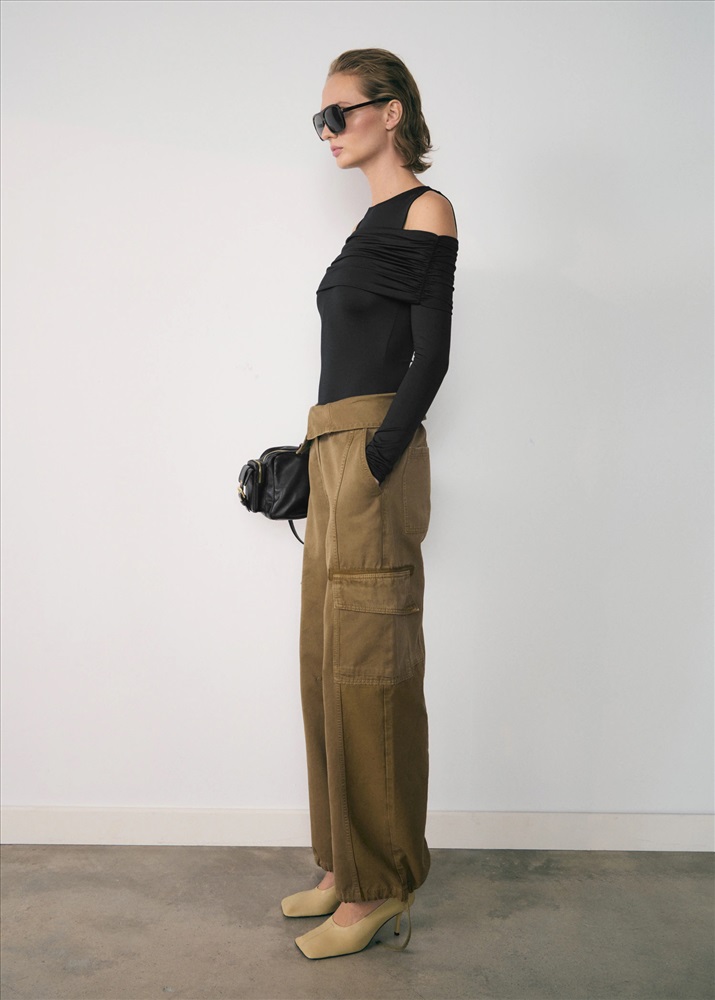 Tejido de algodón estilo tejano vaquero. Diseño cargo. Diseño largo. Tiro bajo. Dos bolsillos cargo. Dos bolsillos de parche en la parte posterior. Cintura con vuelta. Cierre de cremallera y botón. Bajo con goma elástica.