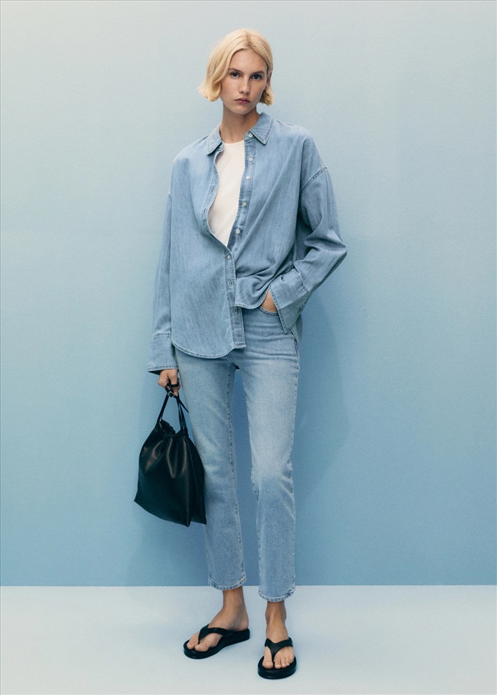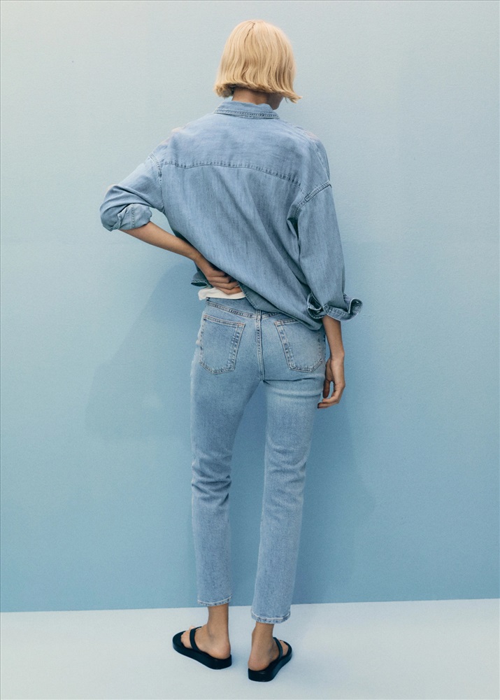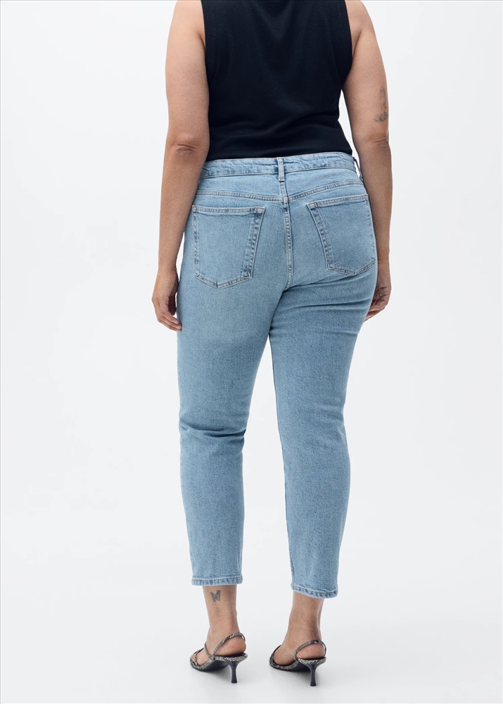 Tejido de algodón estilo tejano vaquero. Diseño crop. Slim fit. Tiro alto. Trabillas. Cinco bolsillos. Cierre delantero de cremallera y botón. Disponible Plus. Largo interior 68 cm.