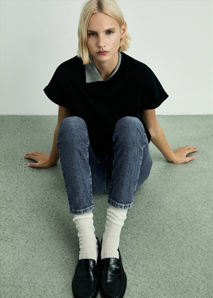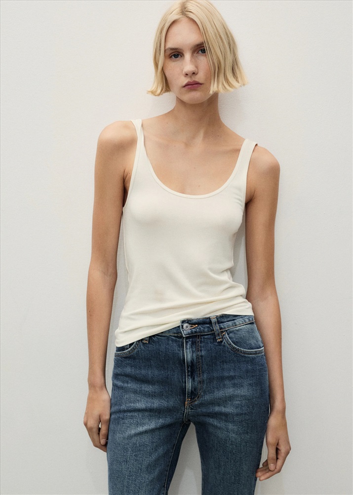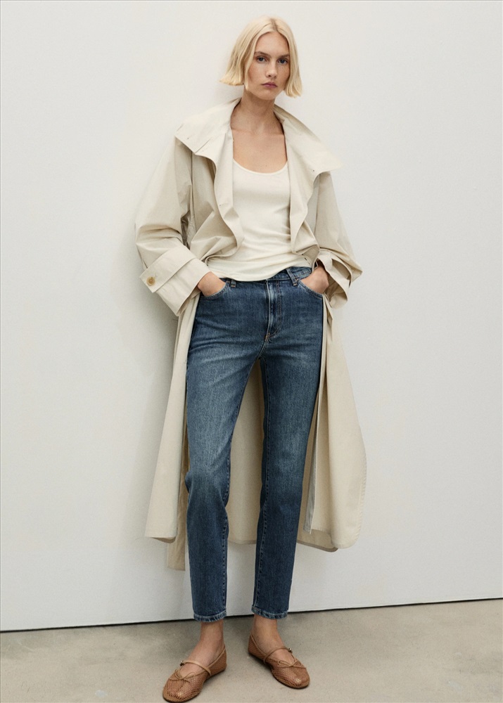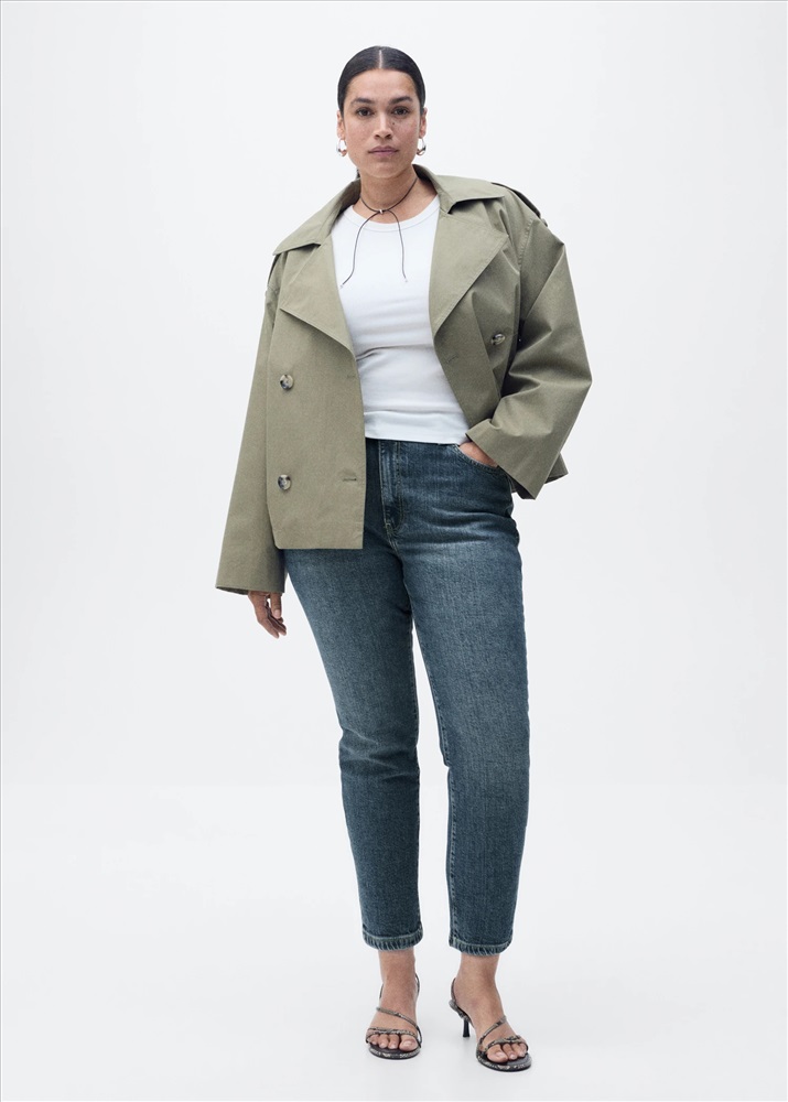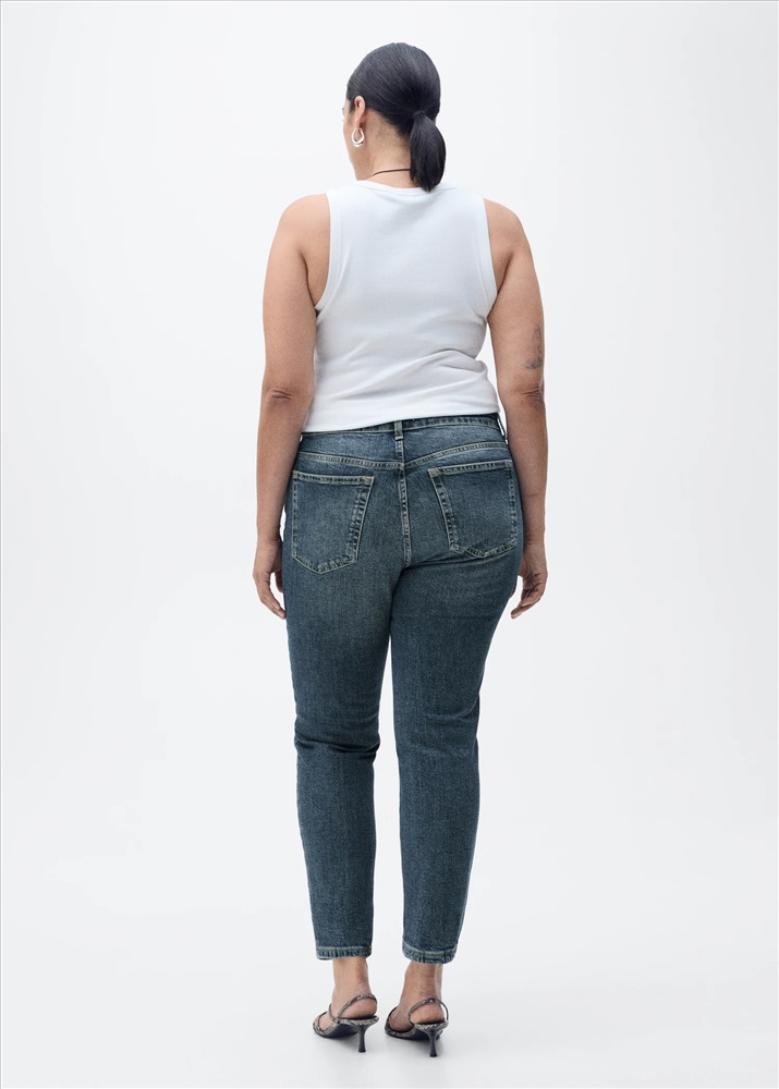 Tejido de algodón estilo tejano vaquero. Tejido elástico. Diseño crop. Slim fit. Tiro alto. Trabillas. Cinco bolsillos. Cierre delantero de cremallera y botón. Largo interior 68 cm. Disponible Plus. Cierre de cremallera y botón.