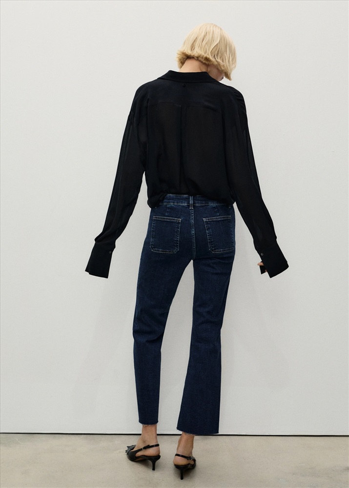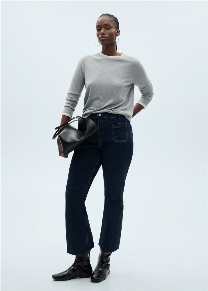 Tejido de algodón estilo tejano vaquero. Estilo flare. Ankle brace. Tiro medio. Trabillas. Dos bolsillos de parche en la parte delantera. Cierre delantero de cremallera y botón. Disponible Plus.