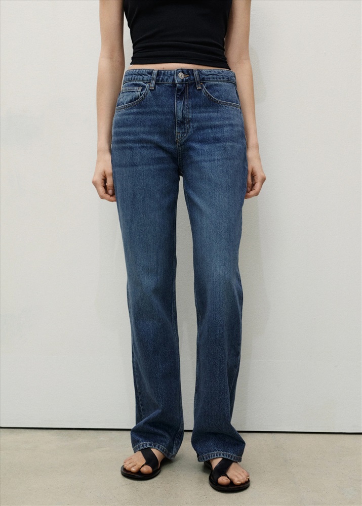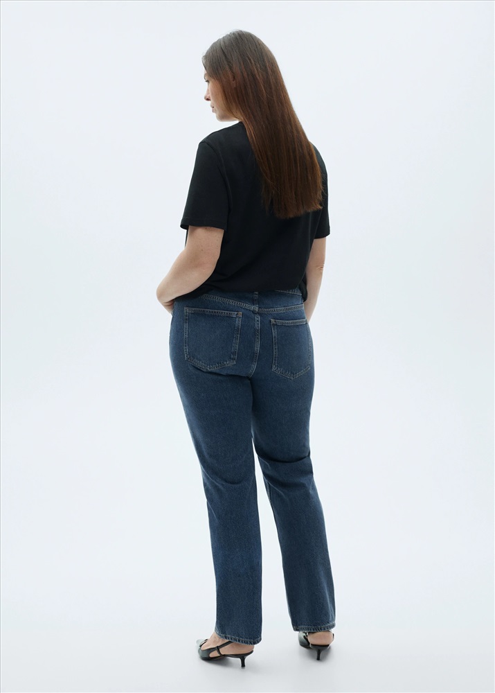 Diseño estándar. Tiro medio. Diseño recto. Cinco bolsillos. Cierre de cremallera y botón. Trabillas. Largo interior 78 cm. Tejido de algodón estilo tejano vaquero. Diseño largo.