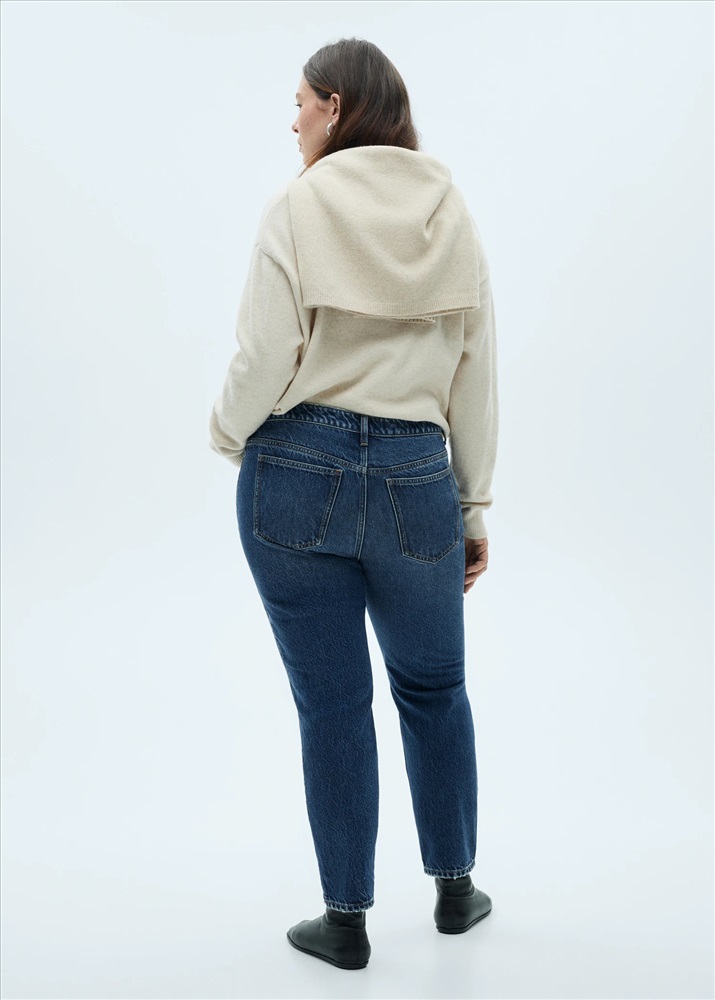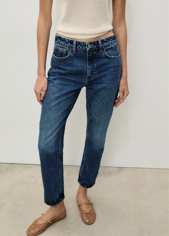 Tejido de algodón estilo tejano vaquero. Mom-fit. Tiro alto. Trabillas. Cinco bolsillos. Cierre de cremallera y botón. Disponible Plus. Largo interior 69 cm.
