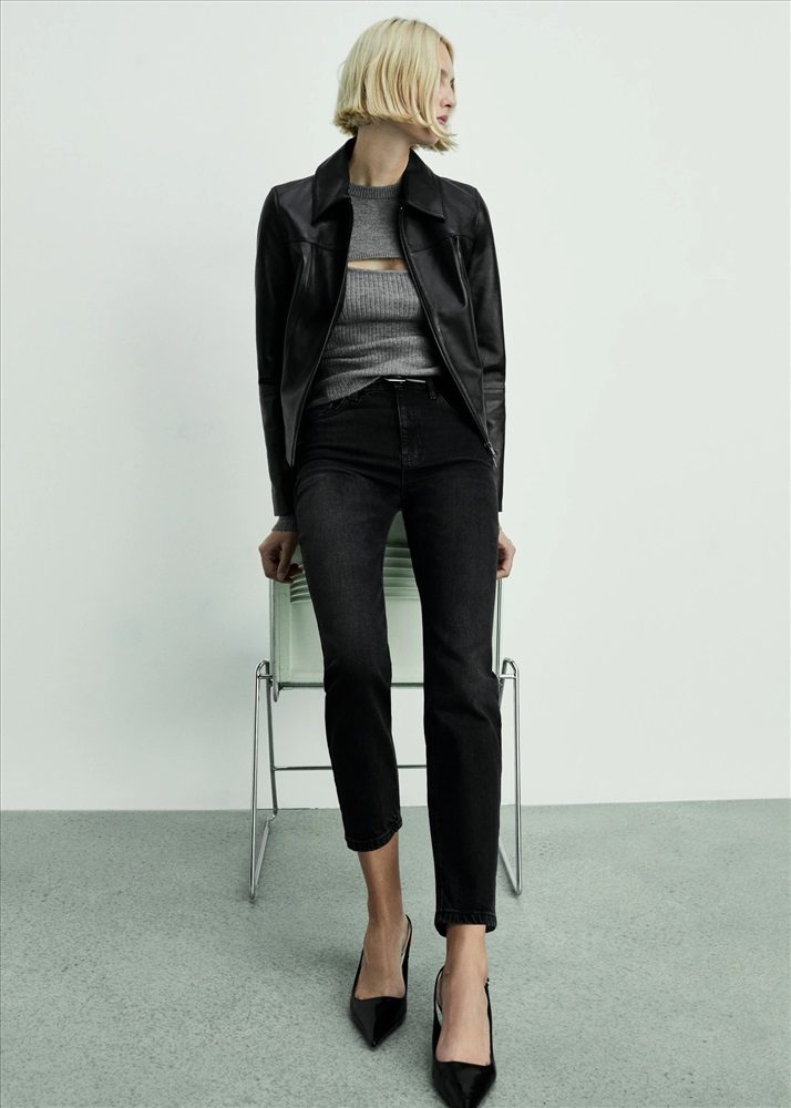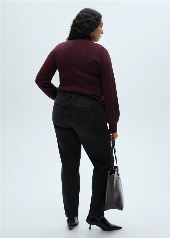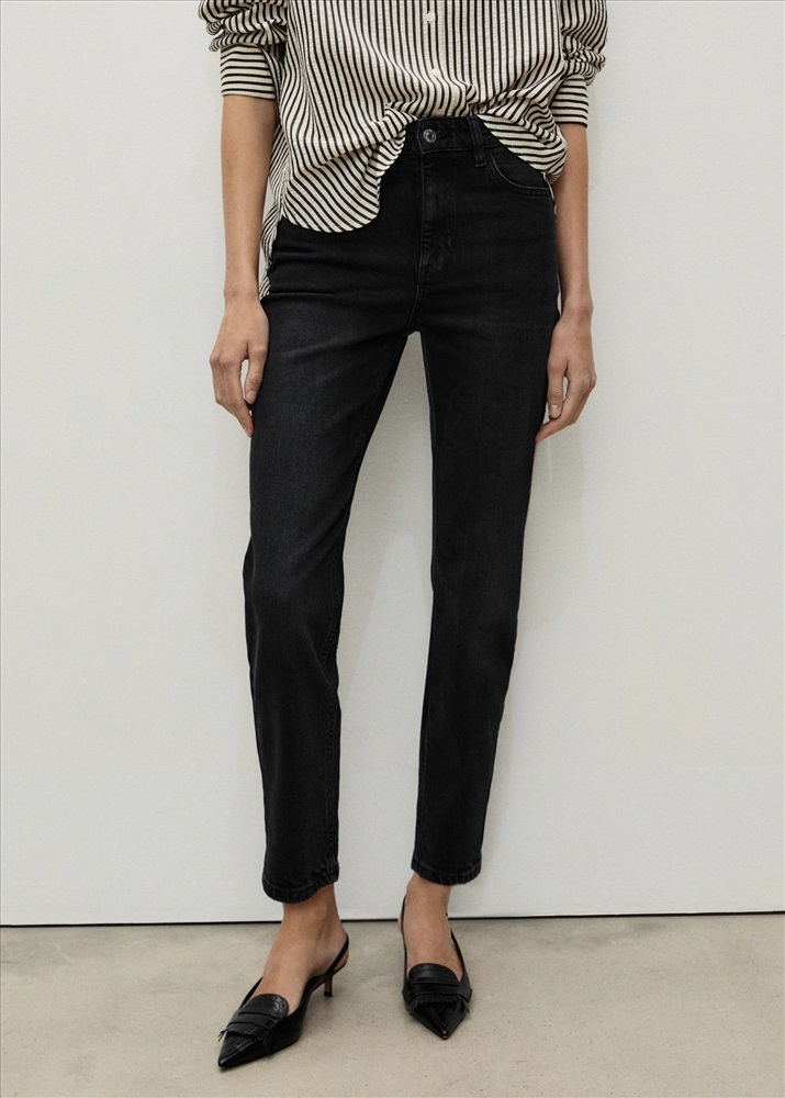 Tejido de algodón estilo tejano vaquero. Tejido elástico. Mom-fit. Tiro alto. Trabillas. Cinco bolsillos. Cierre de cremallera y botón. Disponible Plus. Largo interior 70 cm.