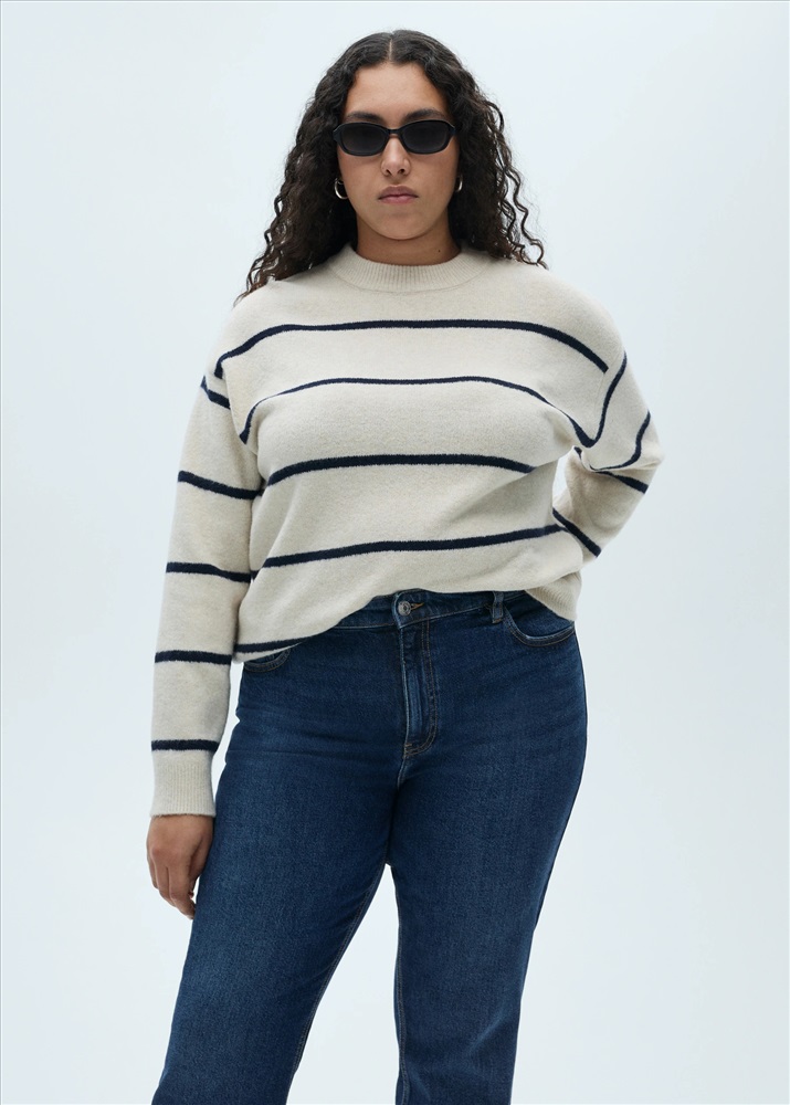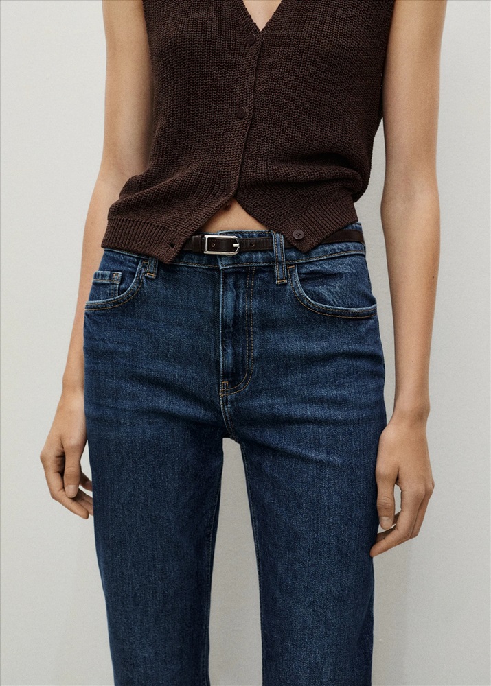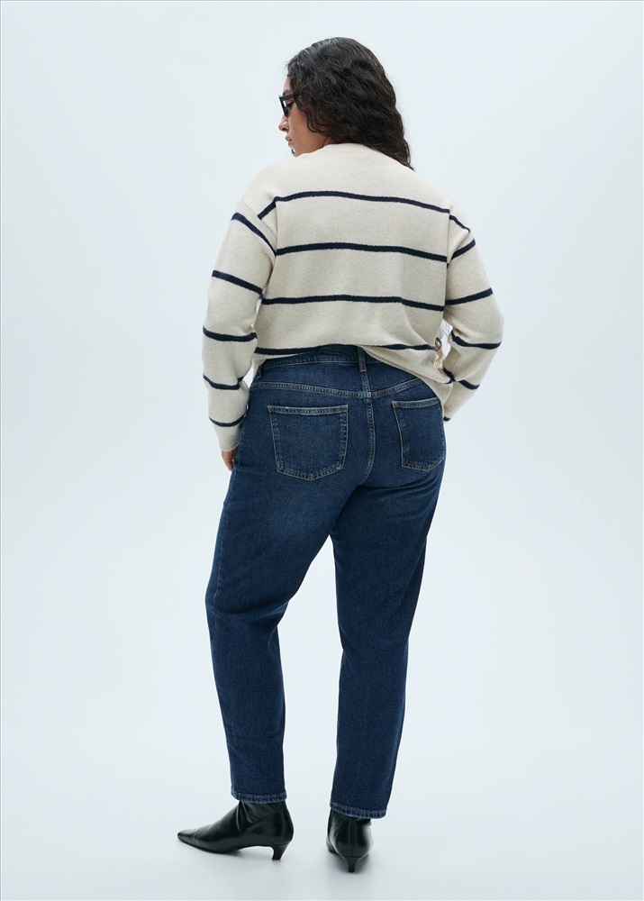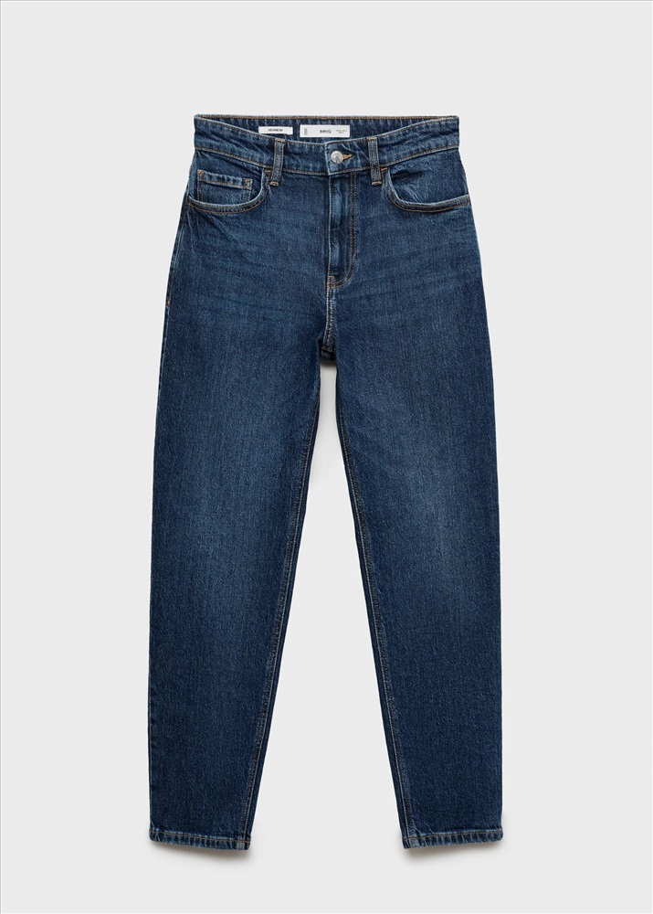 Tejido de algodón estilo tejano vaquero. Tejido elástico. Mom-fit. Tiro alto. Trabillas. Cinco bolsillos. Cierre de cremallera y botón. Disponible Plus. Largo interior 70 cm.