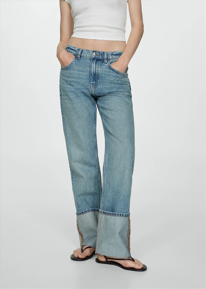 Tejido de algodón estilo tejano vaquero. Diseño recto. Diseño largo. Tiro medio. Trabillas. Cinco bolsillos. Bajo con vuelta. Cierre de cremallera y botón. Largo interior 78 cm.