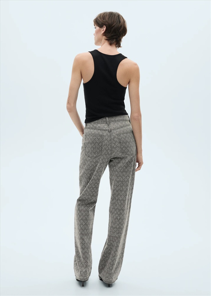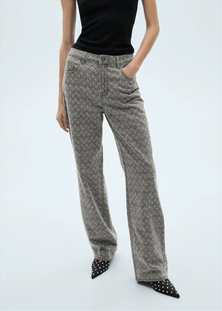 Tejido de algodón estilo tejano vaquero. Diseño recto. Diseño largo. Tiro medio. Trabillas. Cinco bolsillos. Detalle rotos decorativos. Detalle de strass. Cierre de cremallera y botón. Colección fiesta, ceremonia y comunión.