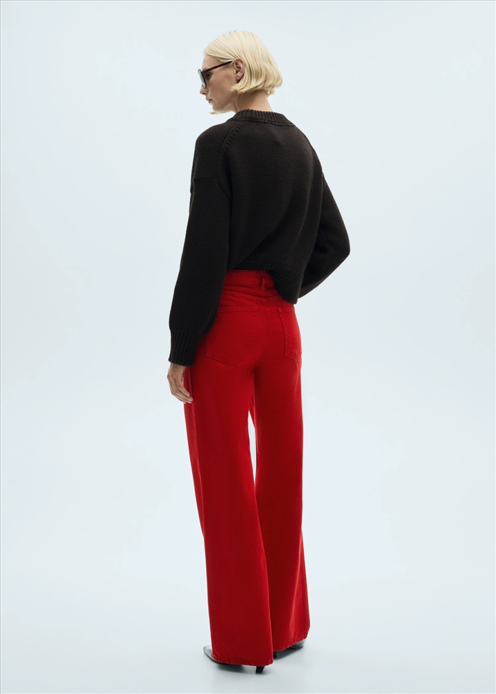 Tejido de algodón estilo tejano vaquero. Diseño largo. Diseño recto. Tiro alto. Cierre de cremallera y botón. Trabillas. Cinco bolsillos.