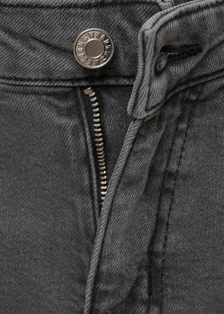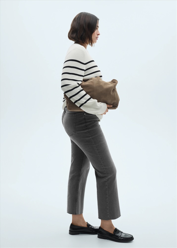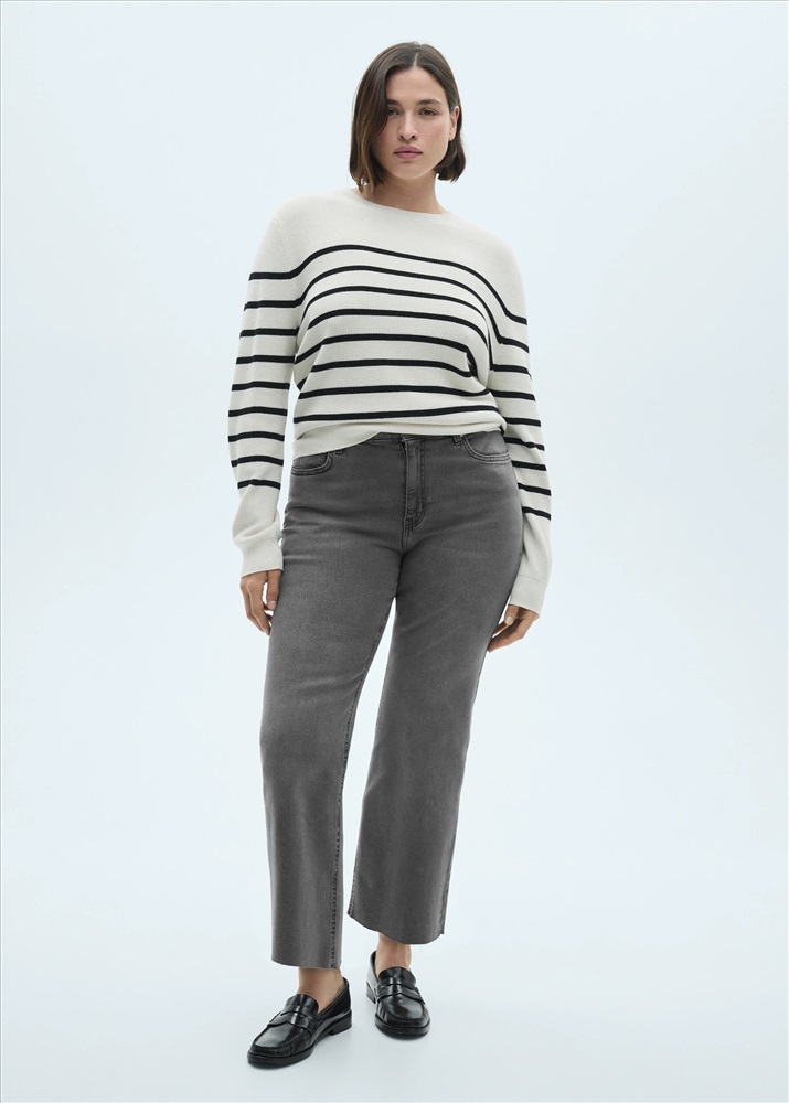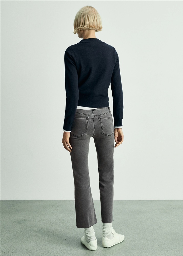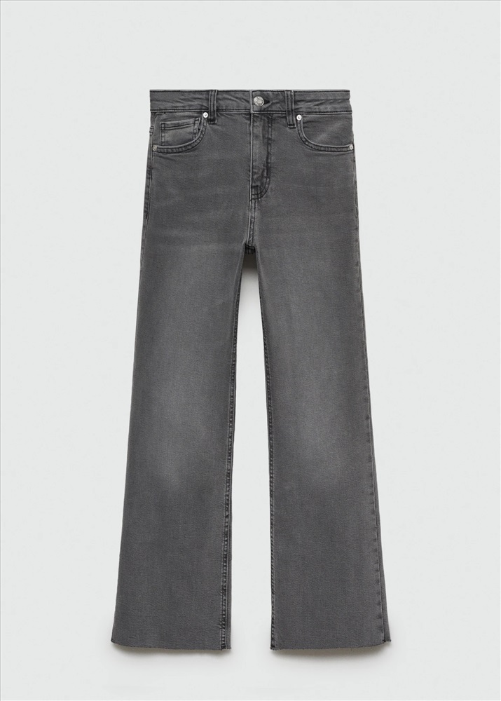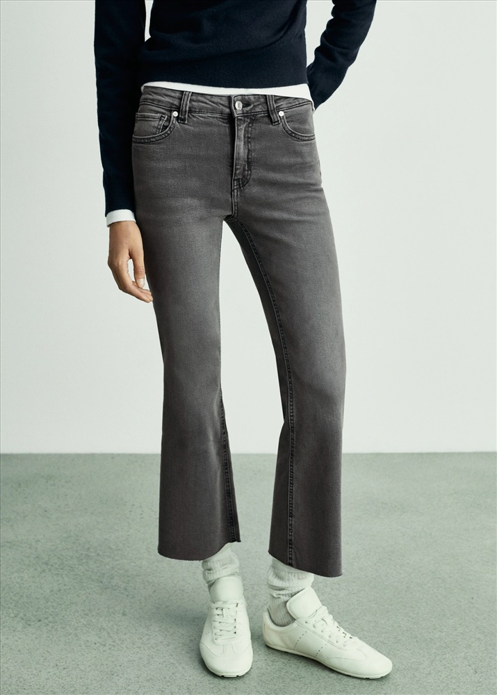 Diseño crop. Tiro medio. Disponible Plus. Cinco bolsillos. Trabillas. Cierre delantero de cremallera y botón. Largo interior 65 cm. Tejido de algodón estilo tejano vaquero. Diseño campana. Estilo flare.