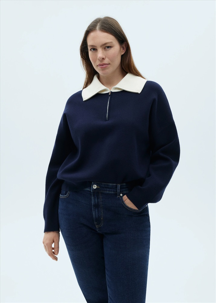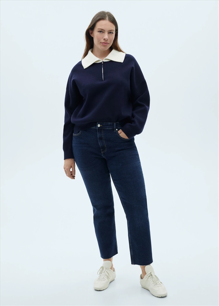 Tejido de algodón estilo tejano vaquero. Tejido elástico. Estilo flare. Diseño crop. Tiro alto. Trabillas. Cinco bolsillos. Cierre de cremallera y botón. Largo interior 65 cm. Disponible Plus. Diseño acampanado.