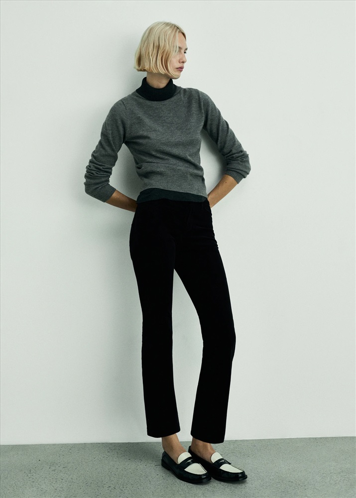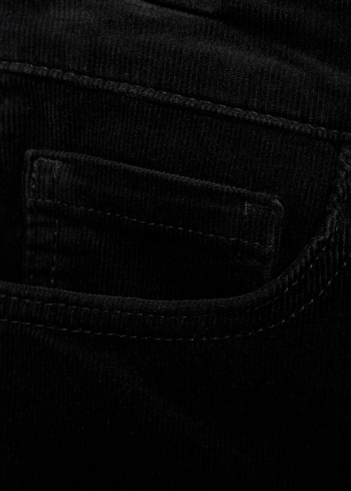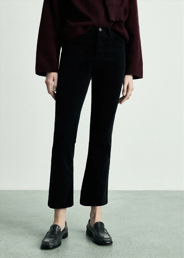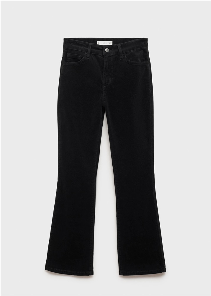 Silueta Acampanado/Flare. Tiro cintura Regular Waist. Estructura plana Medio. Largo Crop. Tejido elástico. Diseño acampanado. Estilo flare. Tiro alto. Trabillas. Cinco bolsillos. Cierre de cremallera y botón. Tejido de pana. Largo interior 65 cm.