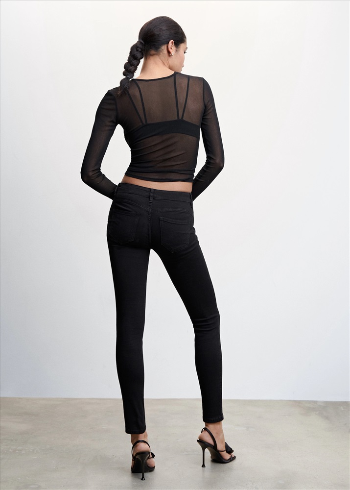 Tejido de algodón estilo tejano vaquero. Tejido mezcla de algodón. Tejido elástico. Diseño largo. Corte skinny. Tiro bajo. Cinco bolsillos. Trabillas. Cierre de cremallera y botón. Largo interior 74 cm. Disponible Plus. Tejido con algodón. Diseño push-up. Diseño estándar. Largo interior 75 cm. Tamaño mediano.