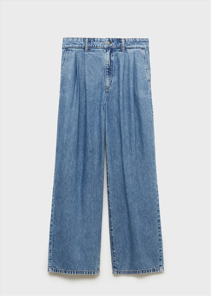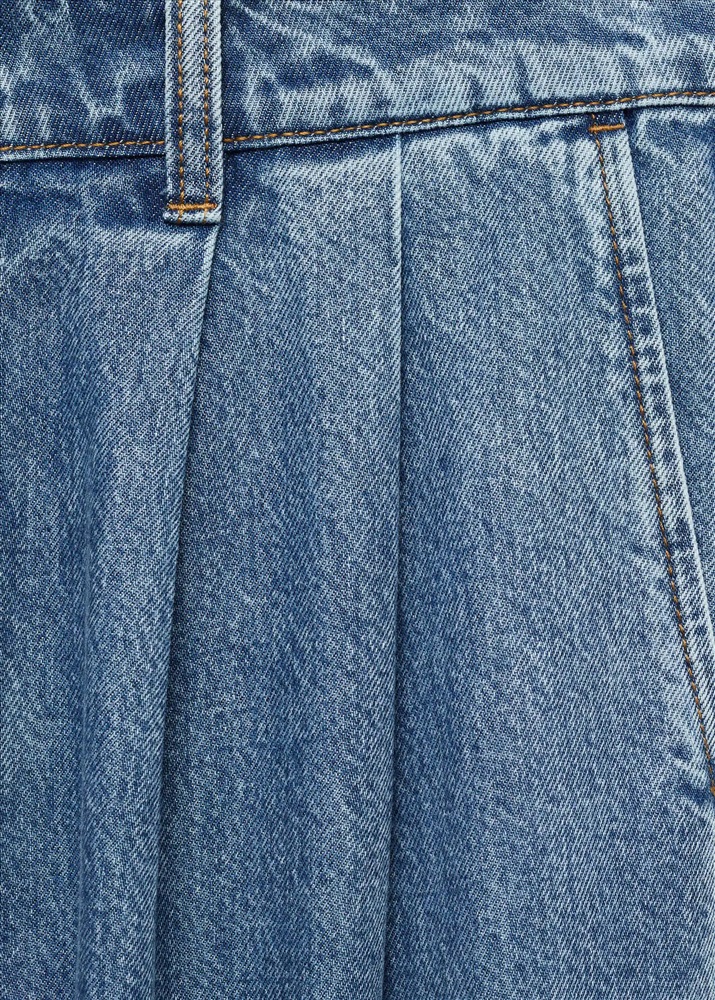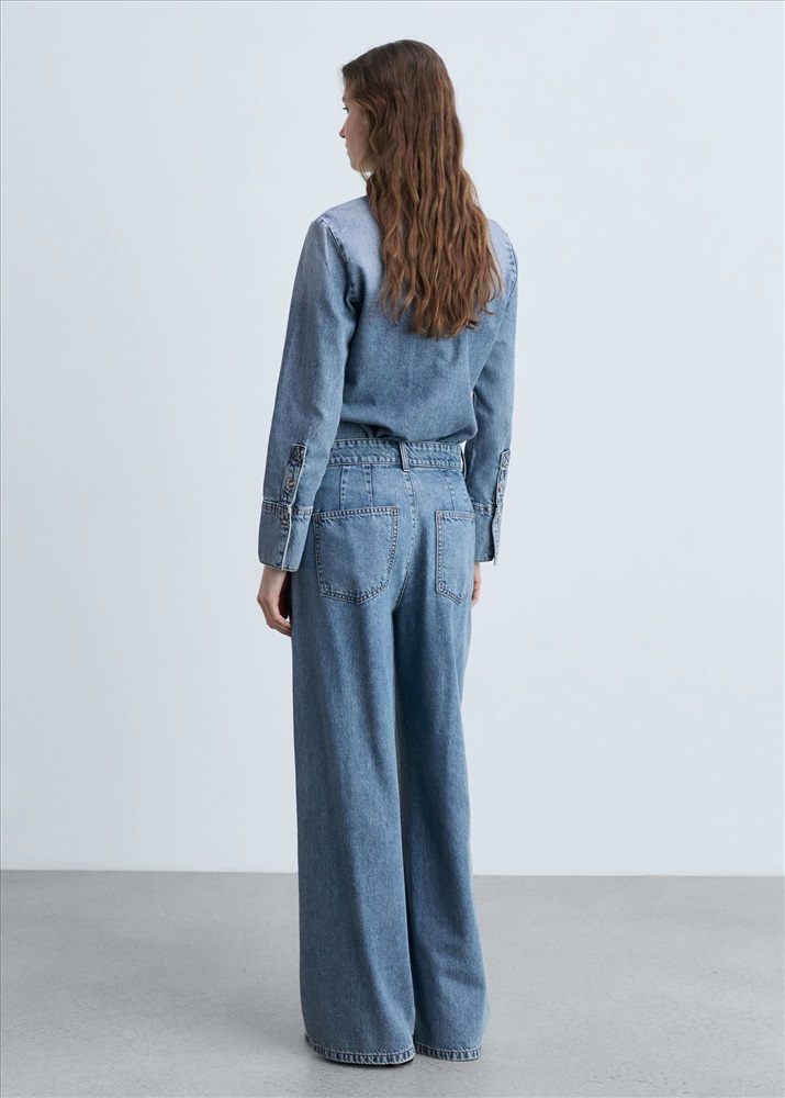 Tejido de algodón estilo tejano vaquero. Diseño largo. Diseño wideleg. Tiro medio. Trabillas. Detalle de pinzas. Dos bolsillos laterales. Cierre delantero de cremallera y botón.