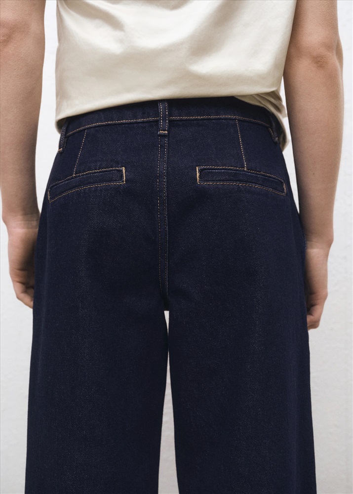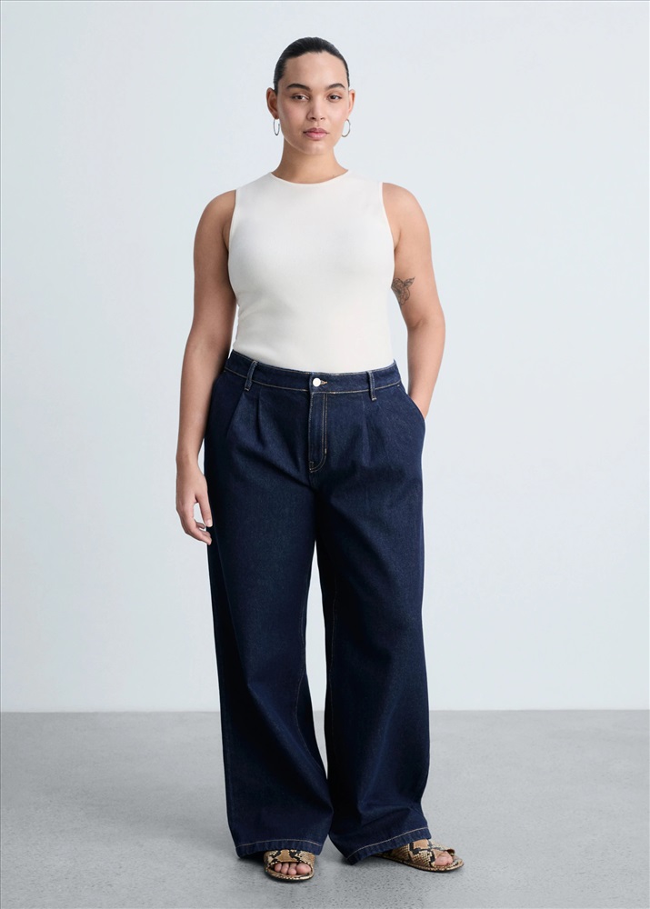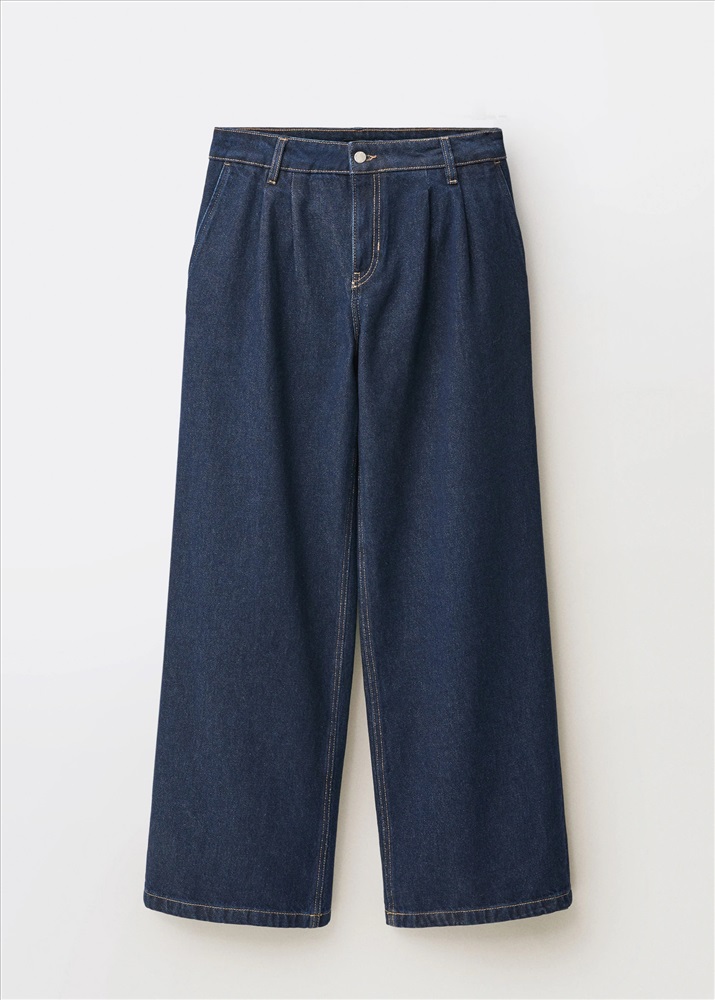 Tejido de algodón estilo tejano vaquero. Rinse wash. Diseño wideleg. Tiro medio. Trabillas. Detalle de pinzas. Dos bolsillos laterales. Dos bolsillos de ribete en la parte posterior. Cierre delantero de cremallera y botón. Largo interior 82 cm. Disponible Plus. Colección Selection.