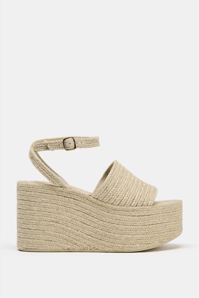 Jute wedge heel sandal shoes. Wide strap on the front. Back straps with metal buckle fastening. Round toe. COMPOSITION, CARE & ORIGIN COMPOSITION UPPER 100% jute LINING 100% polyester SOLE 100% sbs INSOLE 86% jute