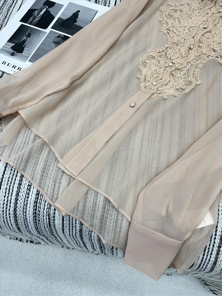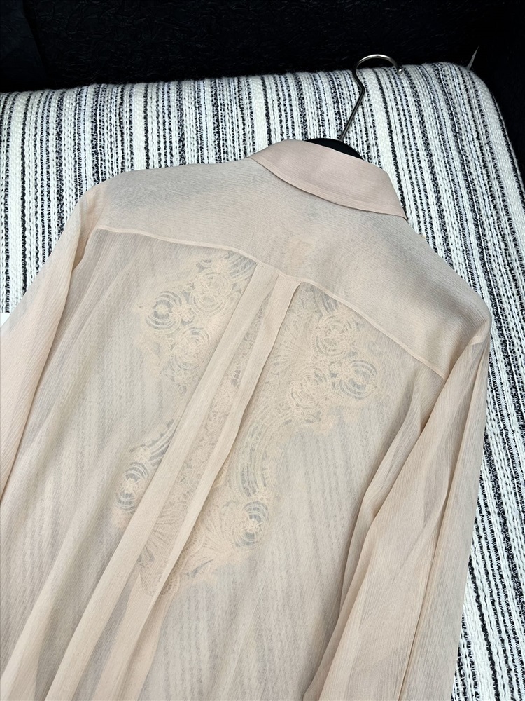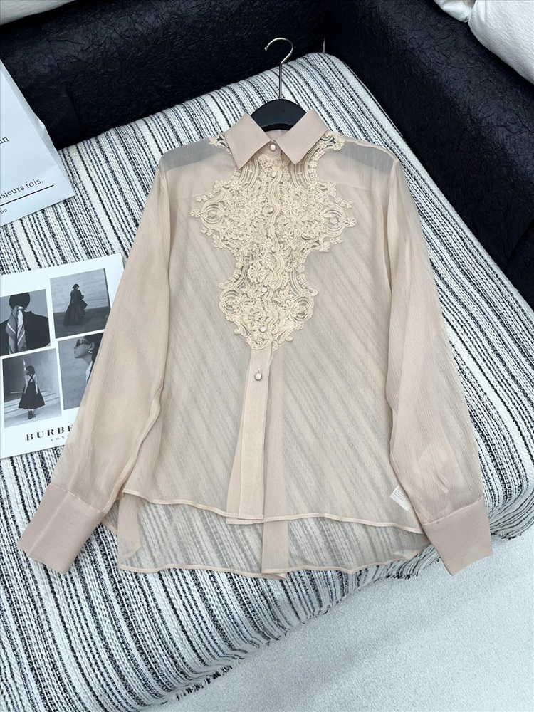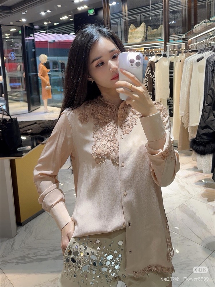 качество люкс Ermanno scervin*|King of Lace 2025, новое поступление, шелковая рубашка с кружевной вышивкой и острым воротником Индивидуальный материал YB из 100% тутового шелка с гладкой текстурой, комфортной и питательной кожей, а также благородным дизайном рубашки с заниженными плечами и острыми лацканами, который модифицирует фигуру, делает вас мягким и элегантным и имеет тяжелую водорастворимую вышивку. Распространение на большой площади в области декольте, плеч, шеи и передней части. Вырисовывающаяся текстура прозрачной основной ткани делает его еще более сексуальным. Великолепное, большое боди, однотонное, универсальное, легко сочетается, классический стиль, многослойное. для создания эффекта юбки, более модные способы игры, легко адаптируется к другим вещам