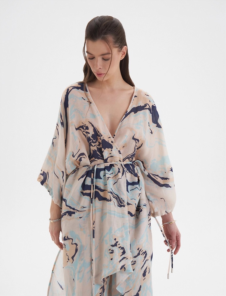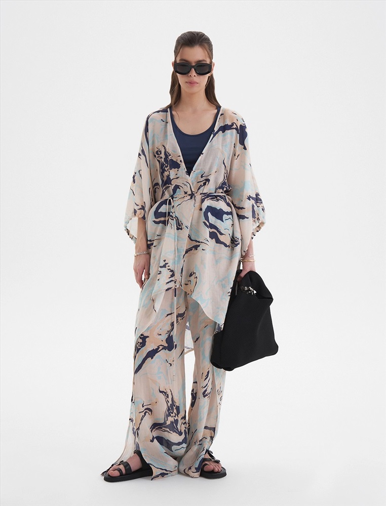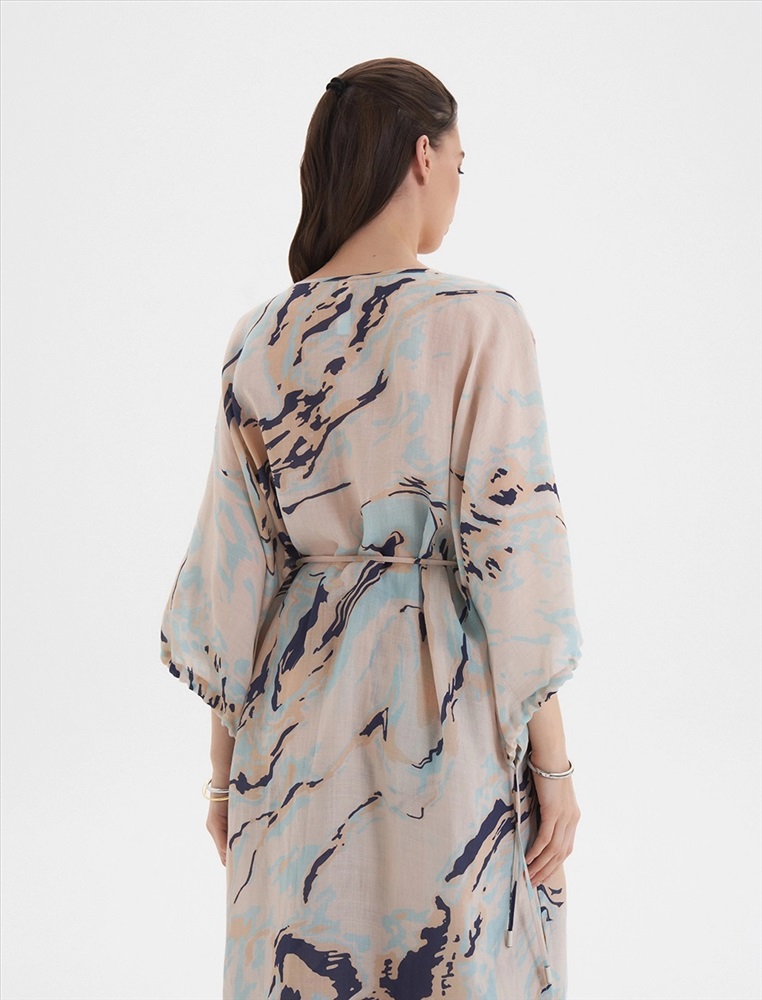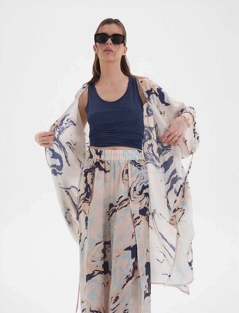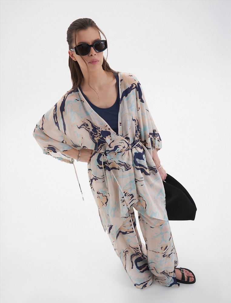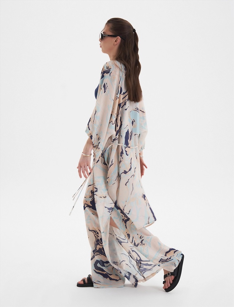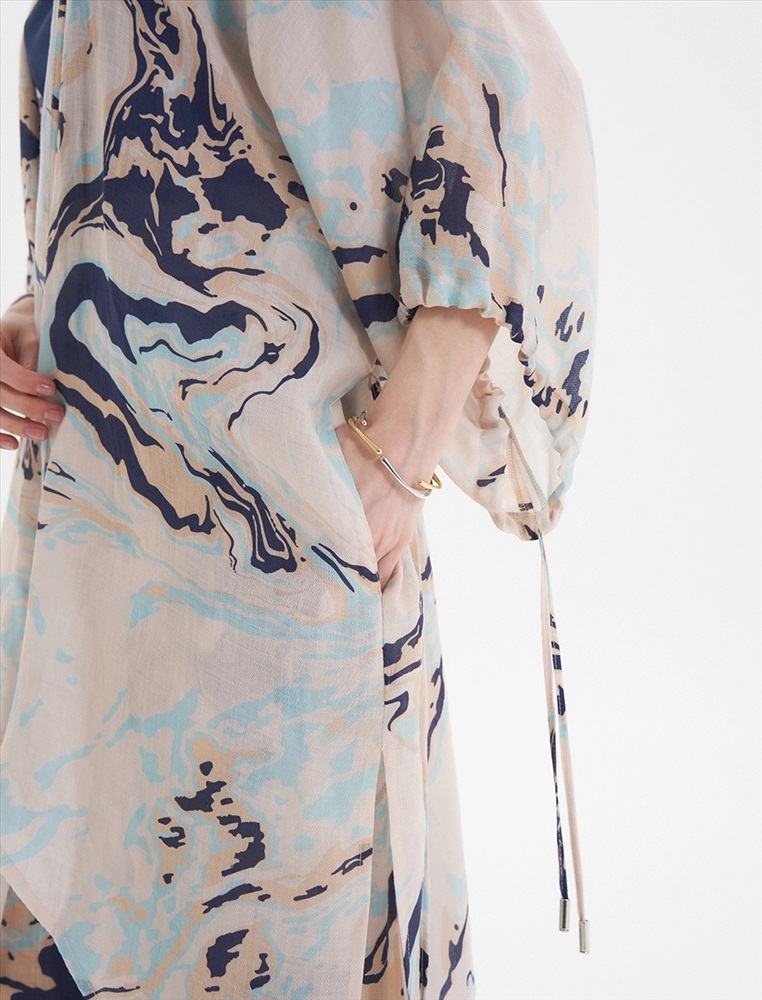 Видео: https-//hassfashion.ru/upload/iblock/b19/dkt9g17pl1m3h37m186ouysgus2974r5.mp4 весна-лето 60% Хлопок, 35% Лен, 5% Шелк Длинный кардиган свободного силуэта с тонким поясом. По низу рукавов резинка. Выполнен из легкой принтованной ткани, в составе которой хлопок, лен и шелк.