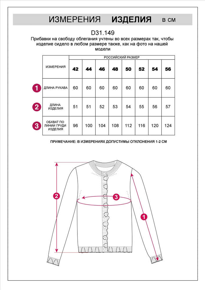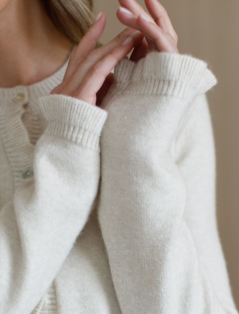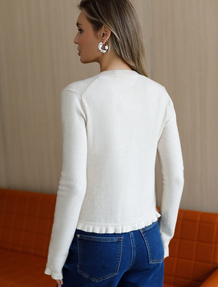 Плотность: 9 GG Размер товара на первом фото: 42 Кардиган выполнен из мягкой меланжевой пряжи с Романтичности прямому силуэту добавляют мягкие воланы по линии пуговиц, на манжетах и краю изделия. Застежка на пуговицы из натурального перламутра. Изделие очень приятное к телу, совершенно не колется и отлично сохраняет тепло. Сочетается в костюме с брюками D38.013, D38.012 и юбкой D36.016 Комментарии к товару