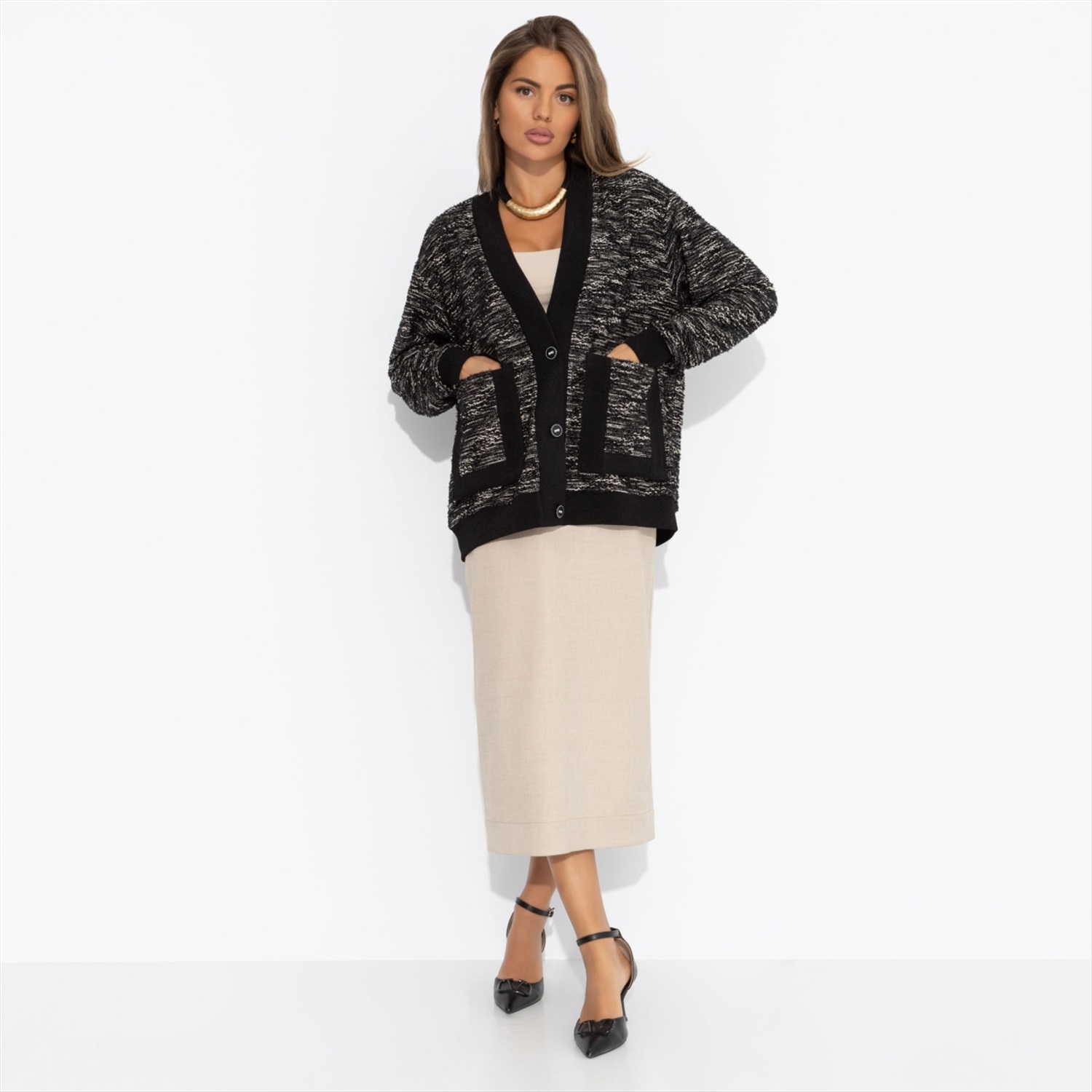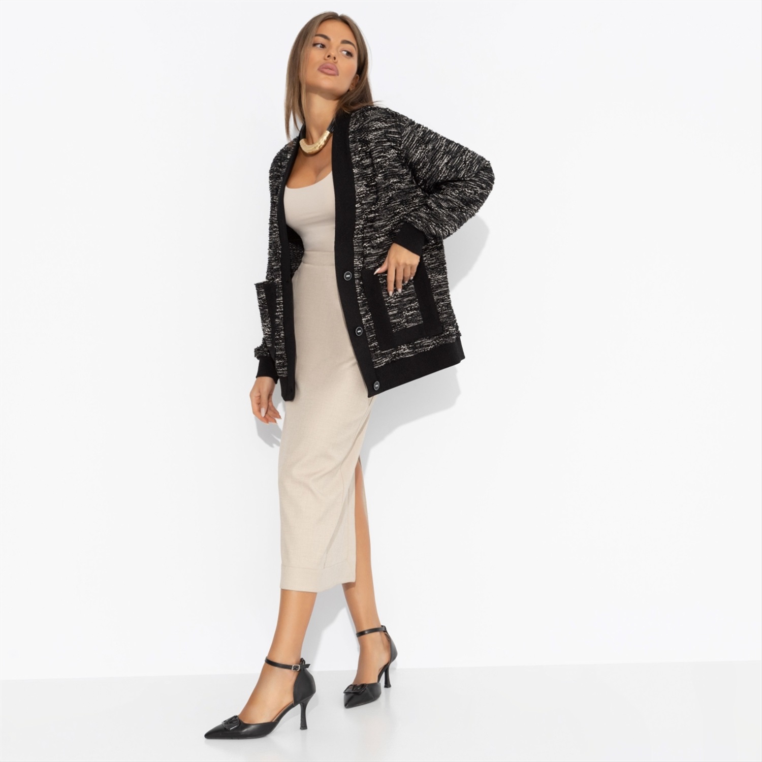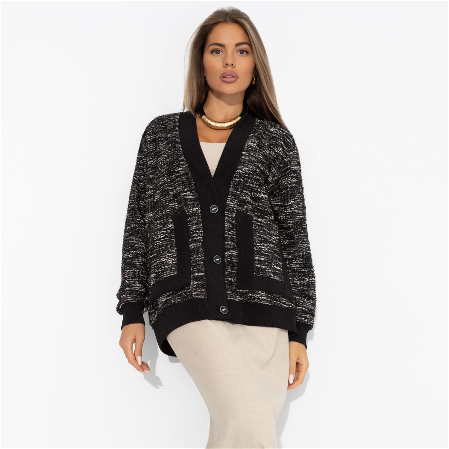 Состав: «жаккард травка», трикотаж креп (65% п/э, 30% акрил, 5% спандекс) Плотность ткани: Средняя Тип ткани: Трикотаж Вид застежки: Пуговица Дополнительный цвет ткани: Черный Карманы: Накладные Основной цвет ткани: Черный Отрезная талия: Нет Подклад: Нет Резинка по талии: Нет Рисунок/раппорт: Нет, все изделия идентичны Сезон: Зима Силуэт: Свободный Стиль: Повседневный Параметры модели на фото: