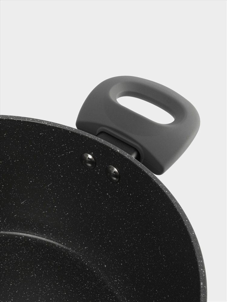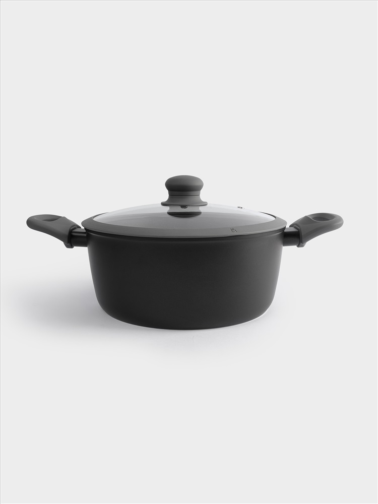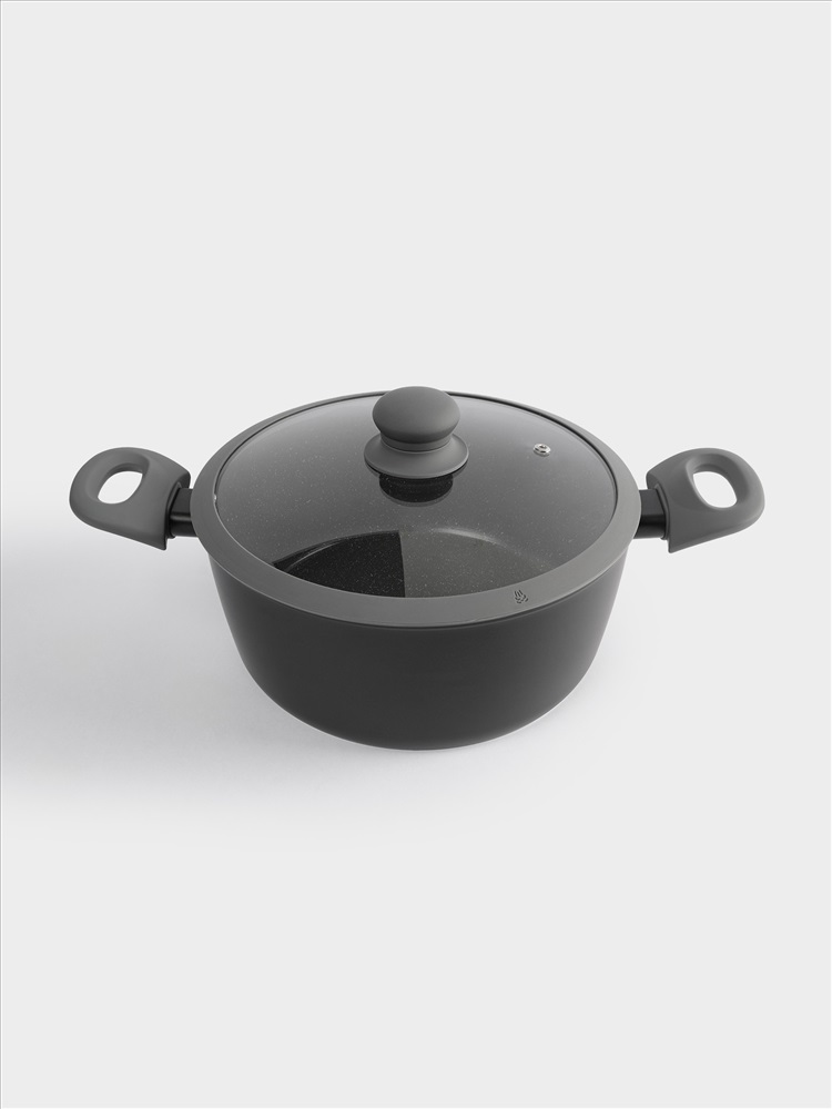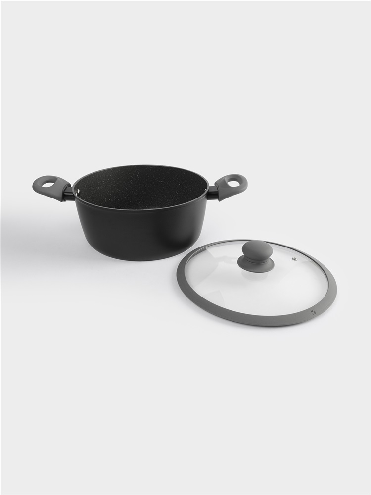 Кастрюля с крышкой. Размер: 24 см. Объем: 3,9 л. Материал: кованый алюминий с двухслойным антипригарным мраморным покрытием, крышка - термостойкое стекло с силиконовым ободком, ручки - бакелит с покрытием Soft touch. Двухслойное антипригарное мраморное покрытие безопасно для здоровья, т.к. не содержит PFOA (перфтороктановая и перфлюорооктановая кислоты); имеет гладкую поверхность, которая позволяет готовить с минимальным количеством масла и выдерживает нагрев до 260ºС; обладает высокой теплопроводностью, износостойкостью и устойчивостью к царапинам. Подходит для использования на всех типах плит, в том числе индукционных. Пустую посуду не подвергать воздействию высоких температур. Рекомендации по уходу: мыть вручную с применением мягких моющих средств. Не использовать для ухода абразивные чистящие средства и жесткие губки. Можно мыть в посудомоечной машине, но это приводит к появлению темного налета на внешней алюминиевой части дна (не влияет на потребительские характеристики самой посуды).