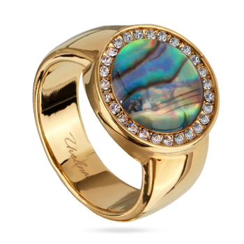 Изготовлено из ювелирного сплава на основе латуни с гальваническим покрытием золотом. Изделие украшает гелиотис. Диаметр мм.