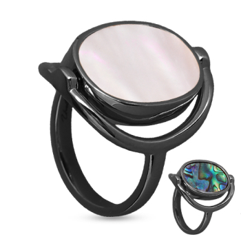 Изготовлено из ювелирного сплава на основе латуни с гальваническим покрытием черным родием. Изделие украшает гелиотис и перламутр. Ширина кольца 2.5см.