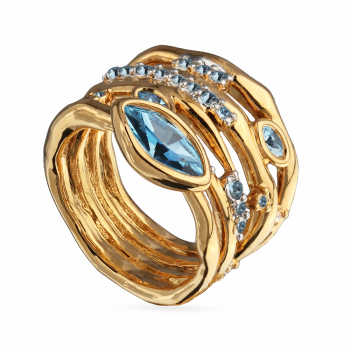 Изготовлено из ювелирного сплава на основе латуни с гальваническим покрытием золотом и родием. Изделие украшают кристаллы SW цвета аквамарин. Ширина кольца 2.1см.