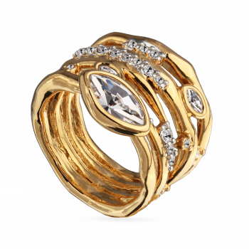 Изготовлено из ювелирного сплава на основе латуни с гальваническим покрытием золотом и родием. Изделие украшают кристаллы SW белого цвета. Ширина кольца 2.1см.