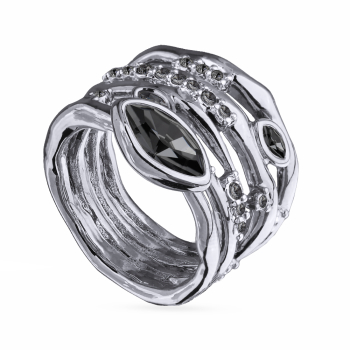 Изготовлено из ювелирного сплава на основе латуни с гальваническим покрытием родием. Изделие украшают кристаллы SW темно-серого цвета. Ширина кольца 2.1см.